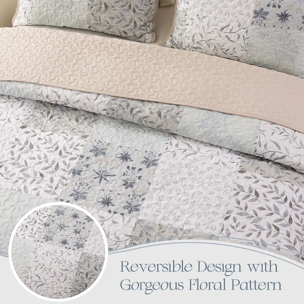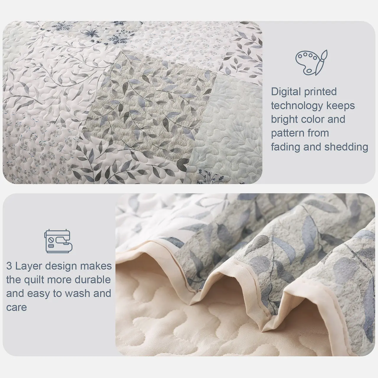 Design: Pastel lightgrey botanical patterns are carefully printed on this quilt bedding set. Thanks to the high-tech digital print technology, this bed cover could keep its vibrant colors and patterns from fading after washing. It is a perfect ornament to your bedroom with unique and reversible design.