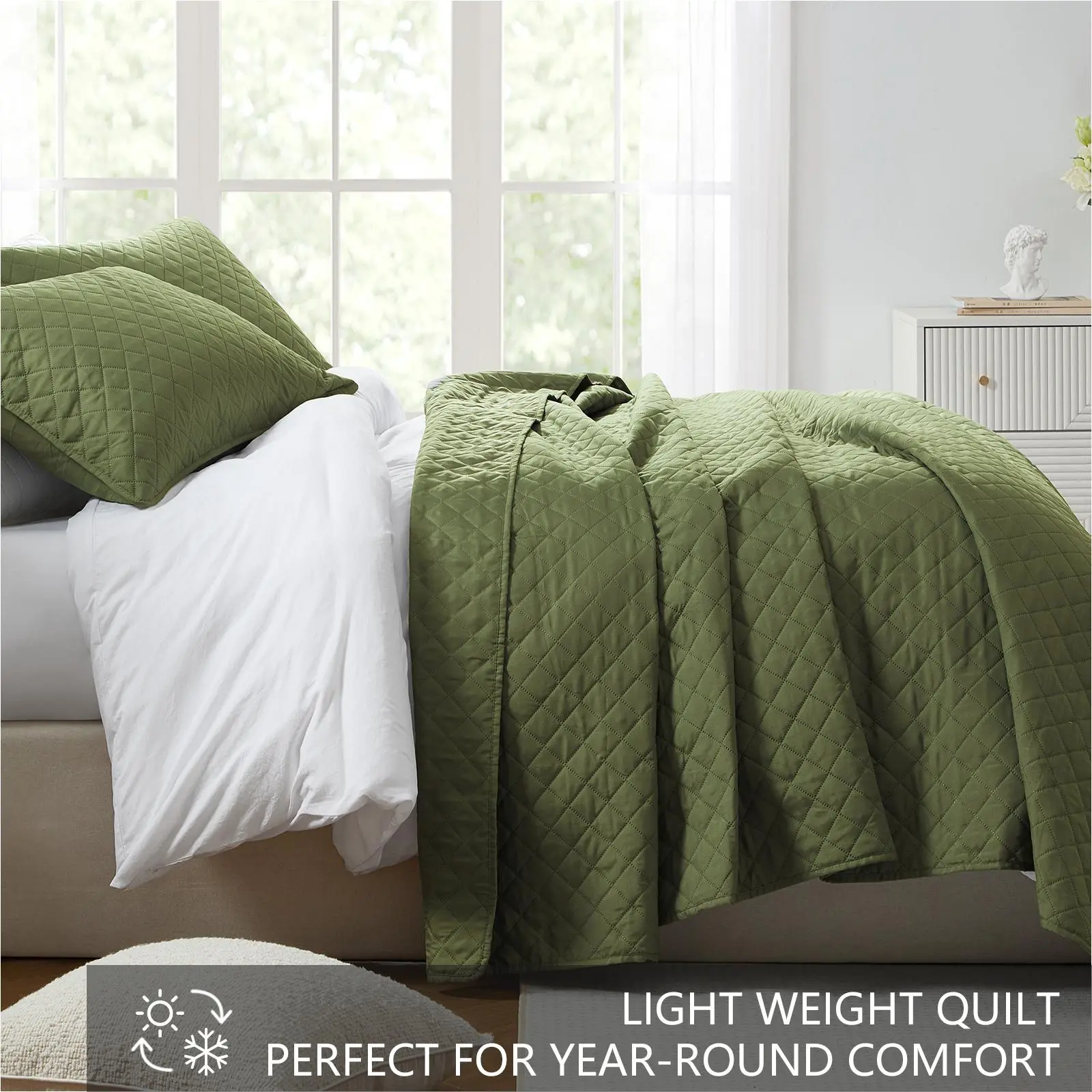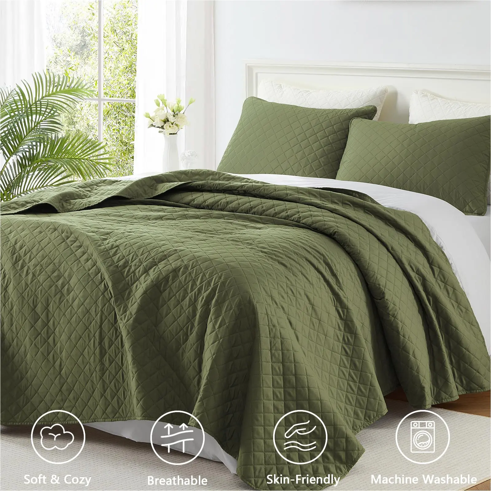This set includes a bedspread and matching olive green sham, designed to provide a cozy and inviting atmosphere.