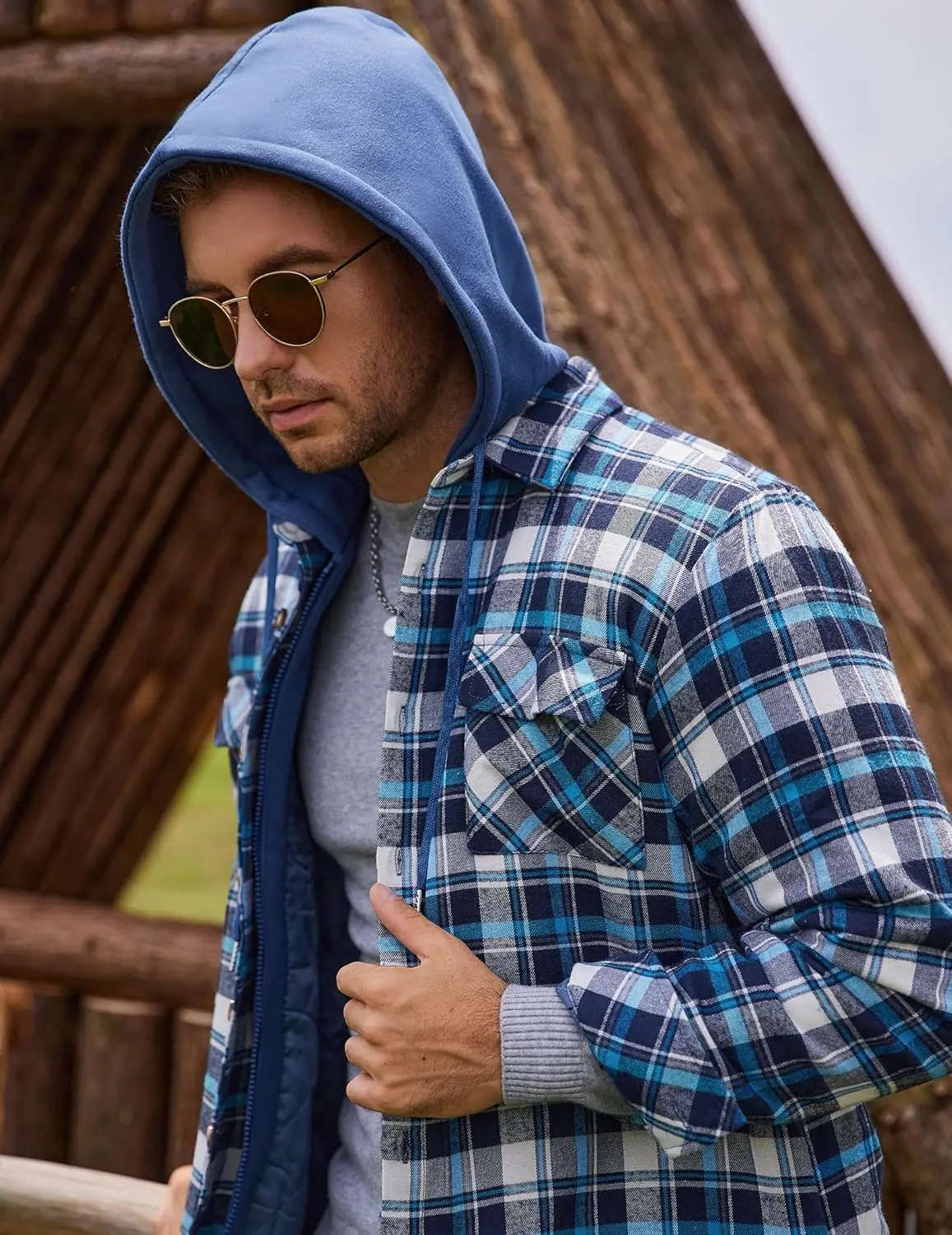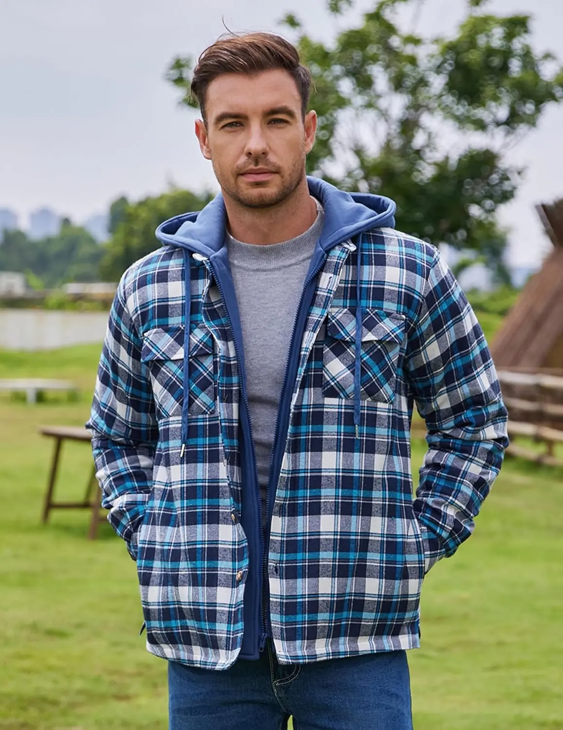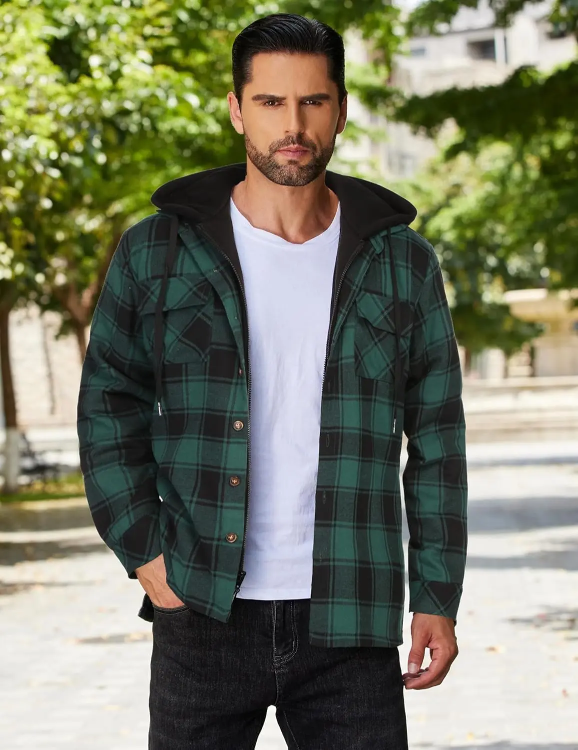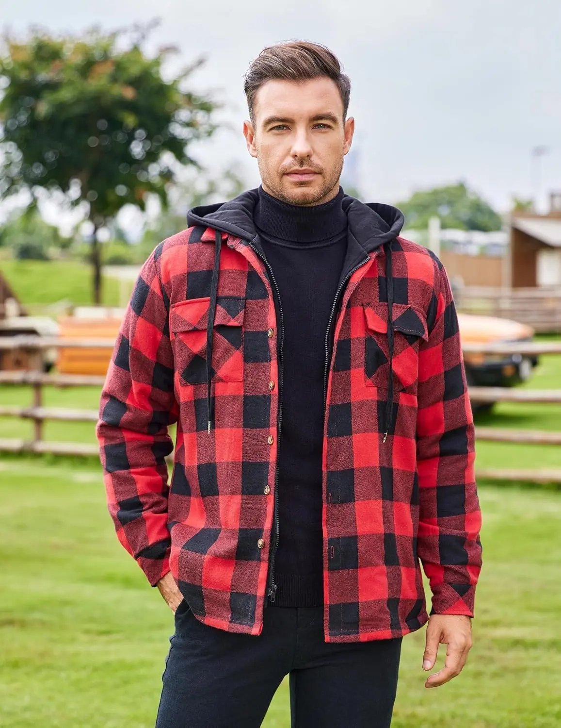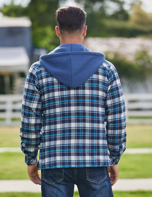 ·Functional Features: Men's plaid flannel jacket with the thickened hood and full zip closure with button placket keeps out any cold winds, making this jacket the perfect all-rounder. 2 breast pockets, 2 slant pockets for storage. Button cuffs to meet the idea that you want to roll it up at any time.