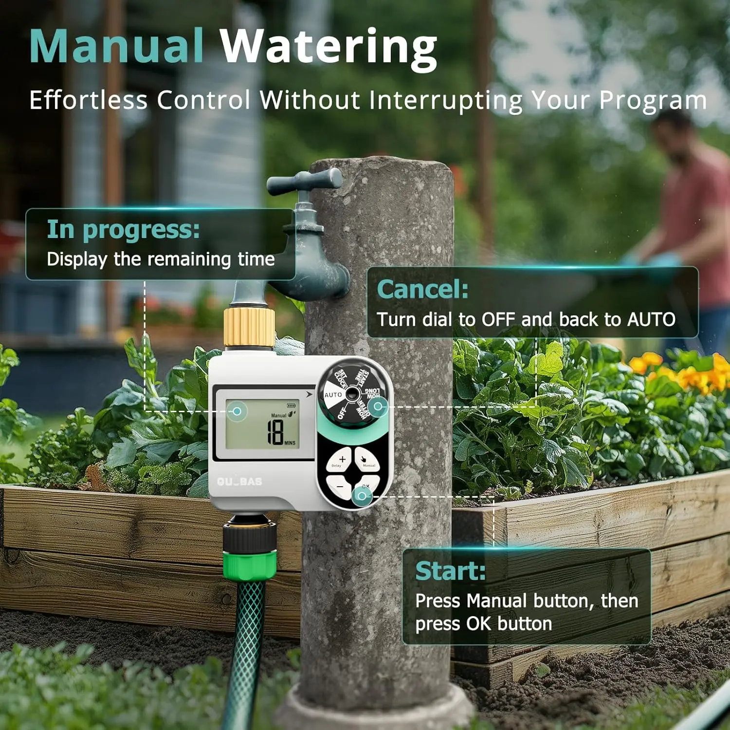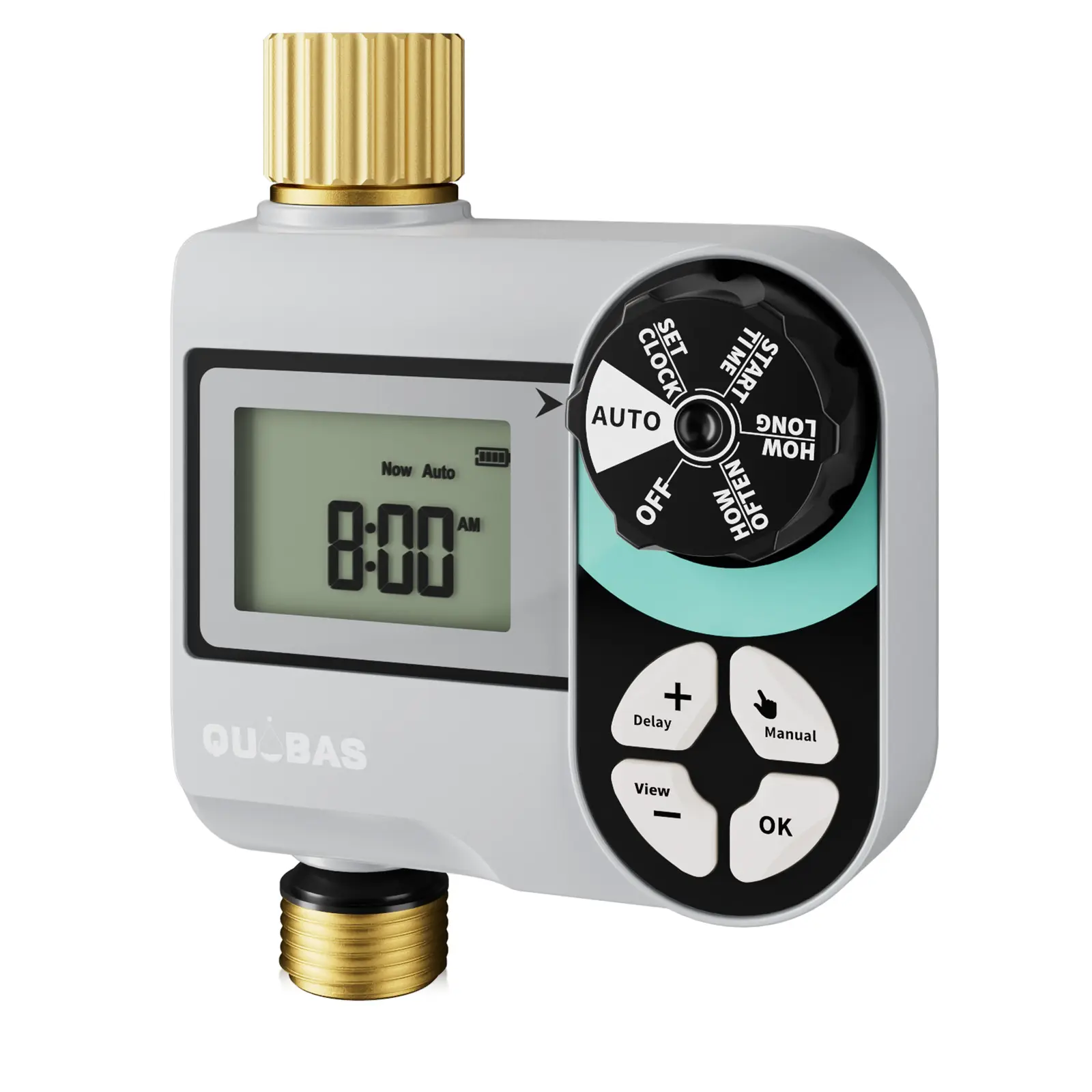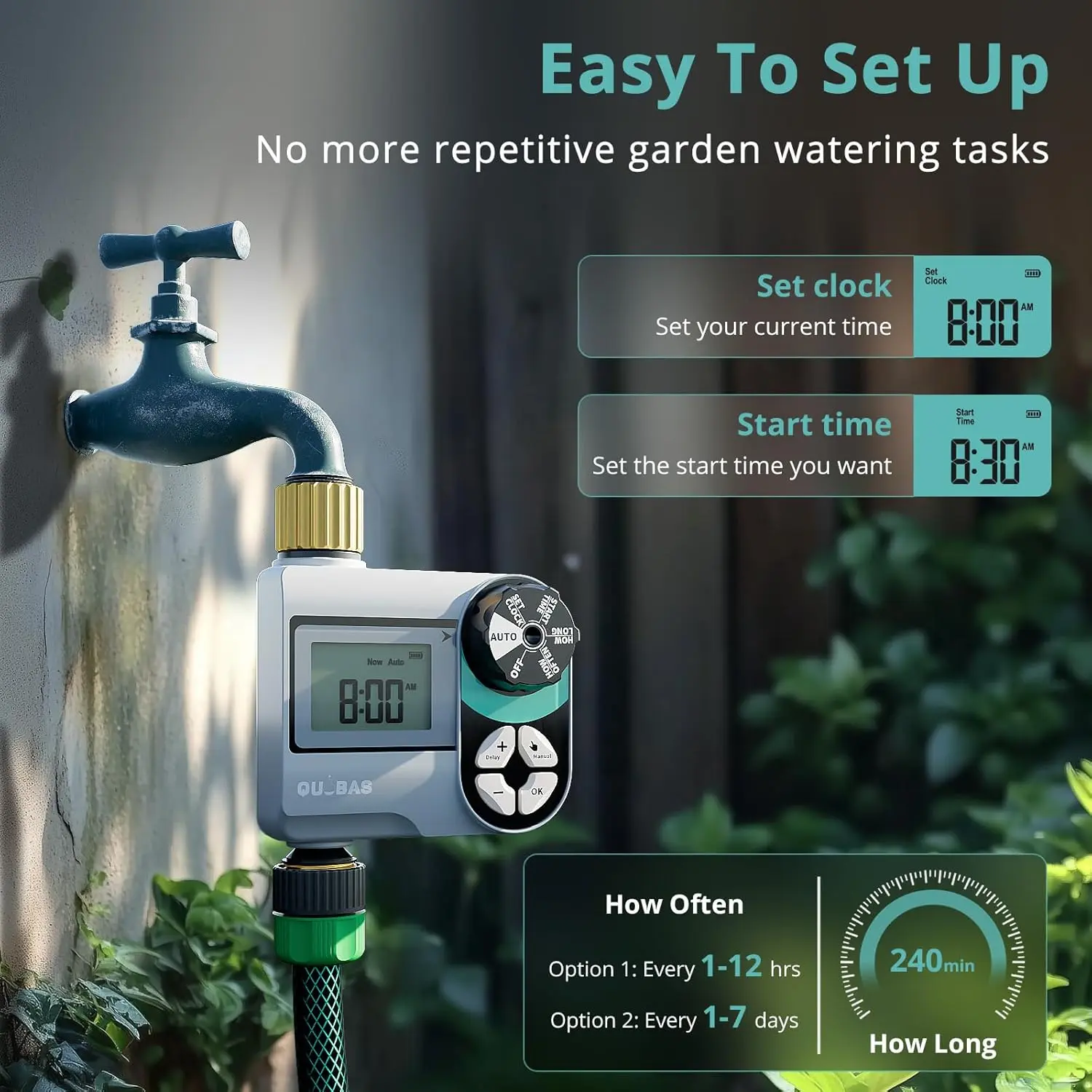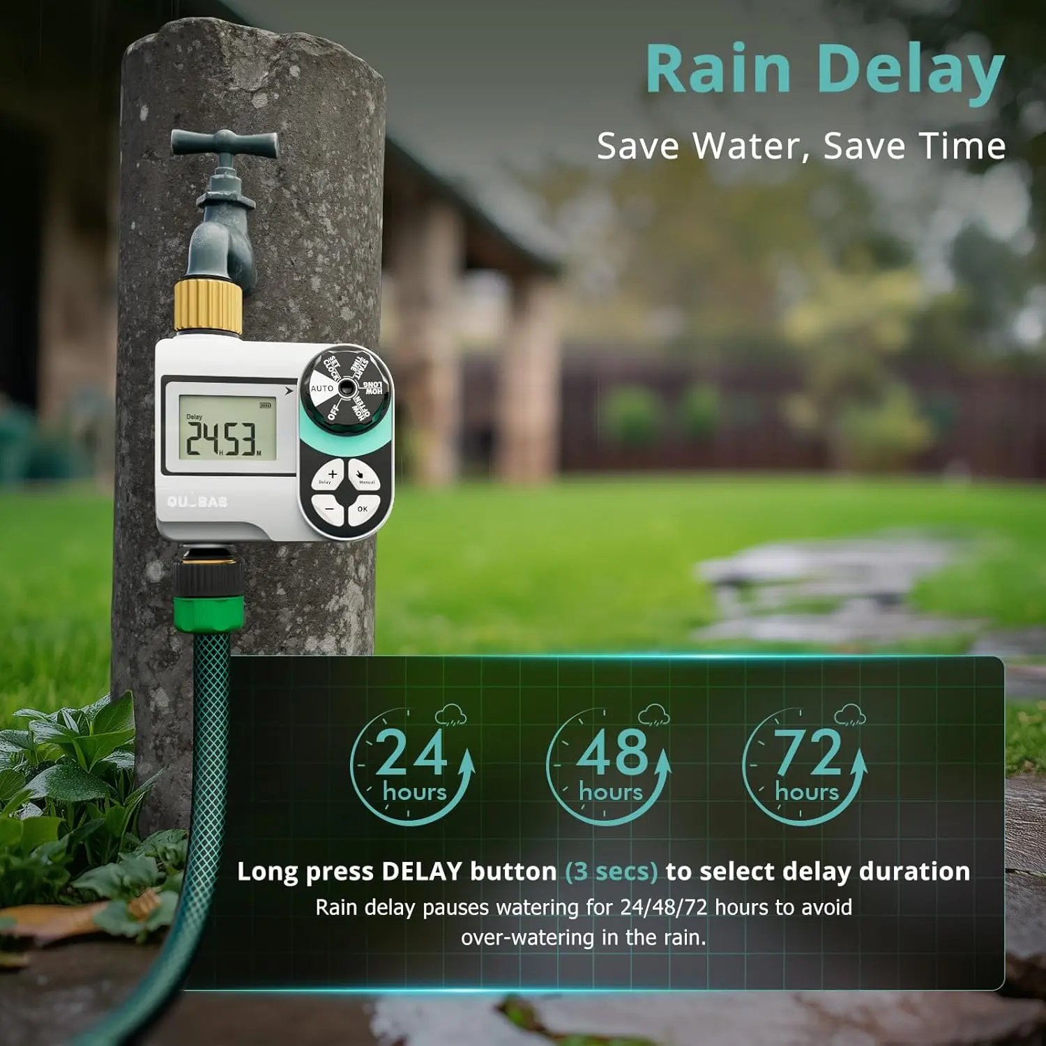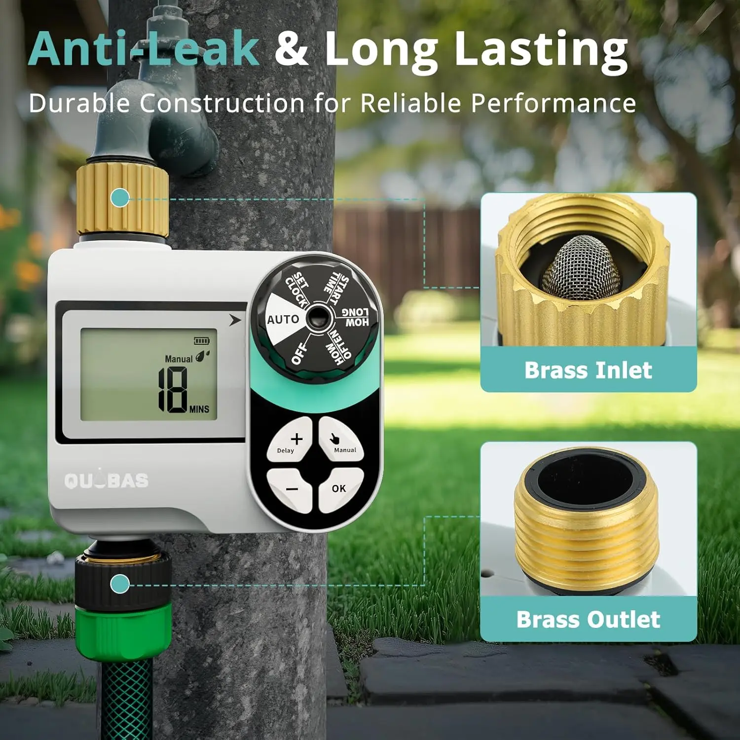 ·Featuring a solid brass inlet and outlet, this timer is built to resist corrosion and withstand harsh outdoor conditions, ensuring a leak-proof connection for years to come. The easy-to-read large LCD screen and intuitive button layout allow you to program watering schedules in seconds: set watering duration from 1 to 240 minutes and frequency from every 1 hour to every 7 days. Equipped with a Rain Delay function, you can temporarily pause your cycle for 24, 48, or 72 hours during wet weather to conserve water, with the program automatically resuming afterward. Whether for sprinklers, drip irrigation, or lawn care, the QUOBAS Water Timer offers reliable, water-saving automation for a healthier, greener garden.