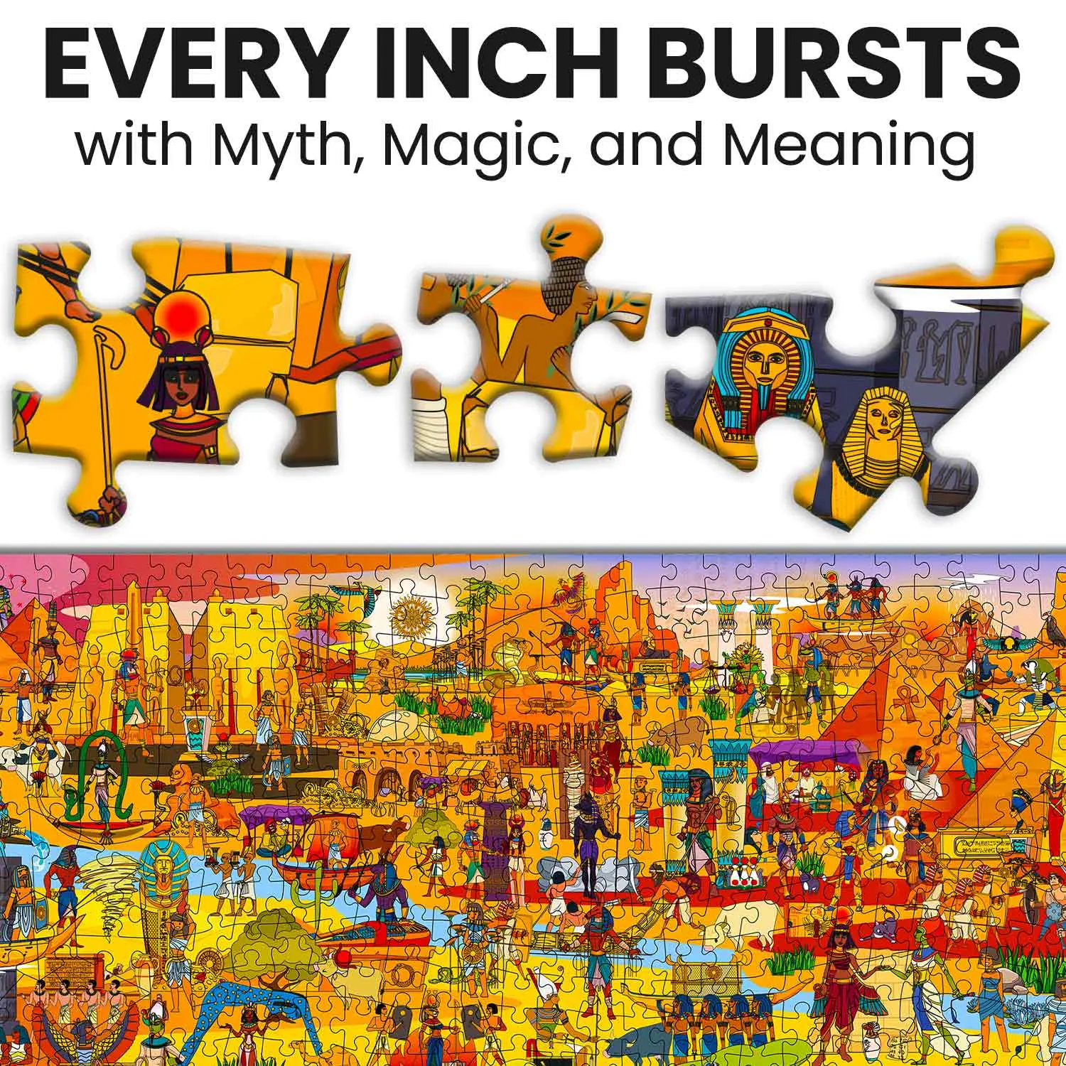 Every piece reveals another fragment of a timeless story, from Ra’s sun chariot to Anubis guarding the afterlife, creating a visually stunning tableau of divine symbolism.