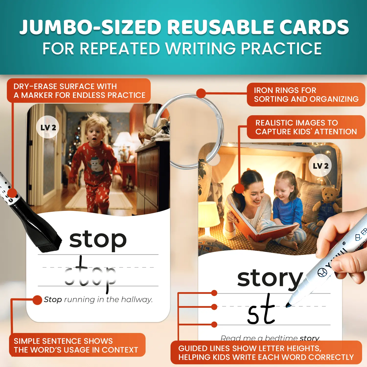 ·Reusable Jumbo-Sized Cards with a dry-erase surface and guided lines for repeated writing practice and letter formation.