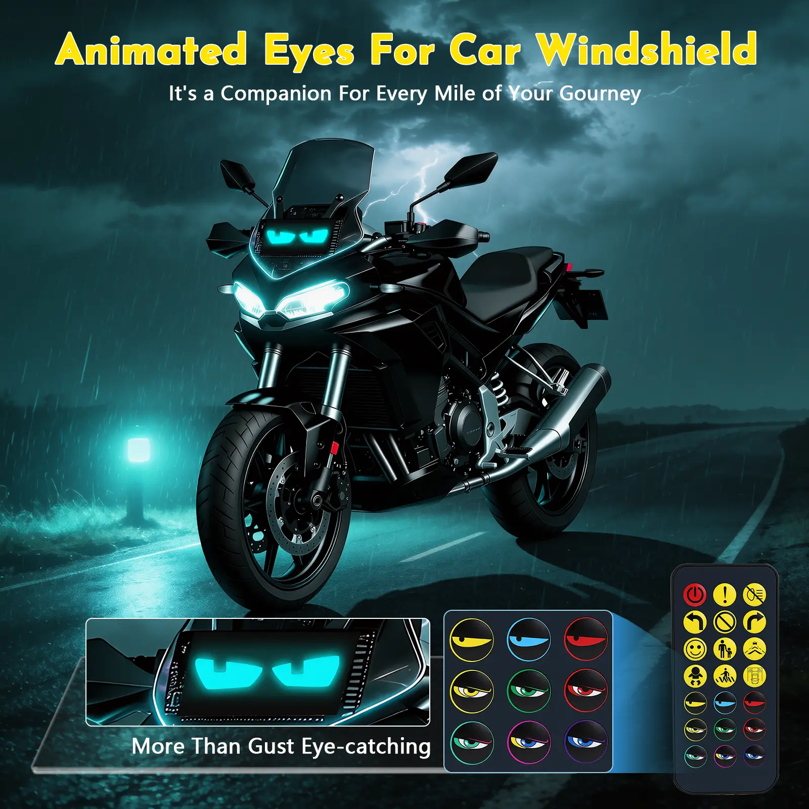 【User-Friendly Design & Easy Installation】Our motorcycle eyes are crafted from flexible, waterproof material for hassle-free setup. No glue required—just stick them securely to any window with double-sided tape. The 14.7-foot USB cable provides flexible placement in cars, homes, or businesses. A versatile accessory for any occasion!