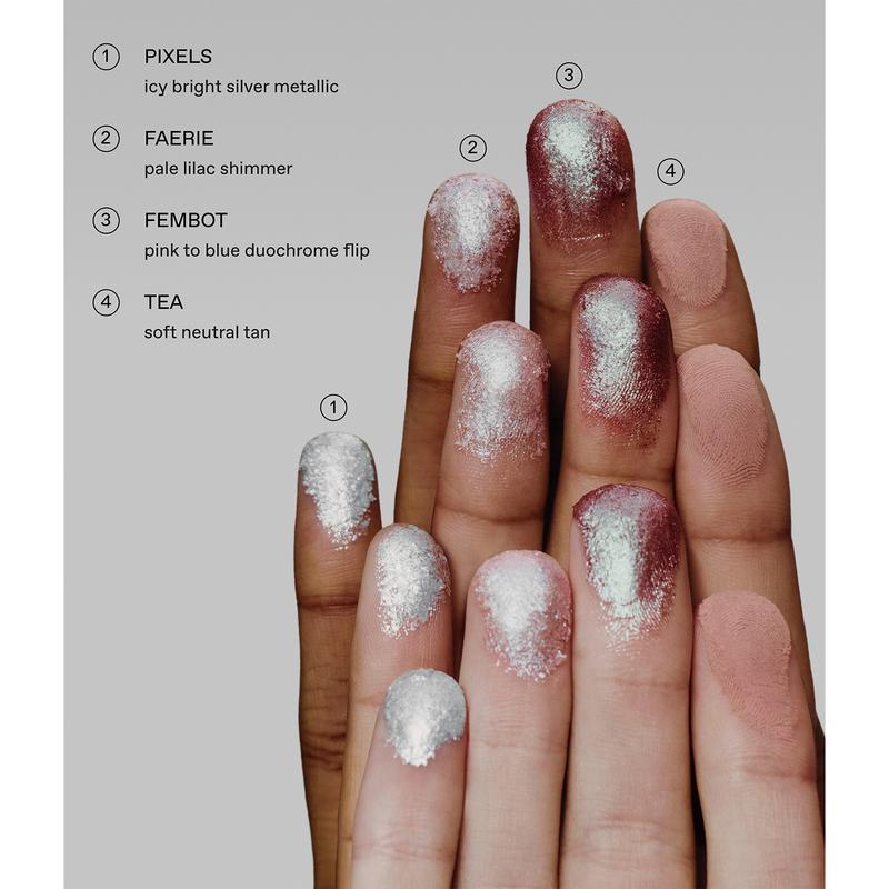 | Ingredients | [Tea] Mica,Oryza Sativa (Rice) Powder,Silica,Magnesium Myristate,Cocoglycerides,Pentaerythrityl Tetraisostearate,Propanediol,Decylene Glycol,Butyrospermum Parkii (Shea) Butter,Magnesium Stearate,C10-18 Triglycerides,1,2-Hexanediol,Lauroyl Lysine,Caprylhydroxamic Acid,Titanium Dioxide (CI 77891),Iron Oxides (CI 77491,CI 77492,CI 77499). [Pixels] Calcium Aluminum Borosilicate,Synthetic Fluorphlogopite,Mica,Hydrogenated Ethylhexyl Olivate,Dimethicone,Octyldodecanol,Hydrogenated Vegetable Oil,Polyhydroxystearic Acid,Dodecane,Coconut Alkanes,Disteardimonium Hextorite,Octyldodecyl Stearoyl Stearate,Ethylhexyl Polyhydroxystearate,Hydrogenated Olive Oil Unsaponifiables,Propylene Carbonate,Tin Oxide,Neopentyl Glycol Diethylhexanoate,Dimethicone/Vinyl Dimethicone Crosspolymer,Coco-Caprylate/Caprate,Simmondsia Chinensis (Jojoba) Seed Oil,Titanium Dioxide (CI 77891). [Fembot] Mica,Calcium Aluminum Borosilicate,Disteardimonium Hectorite,Iron Oxides (CI 77491). [Faerie] Calcium Aluminum Borosilicate,Iron Oxides (CI 77491). |