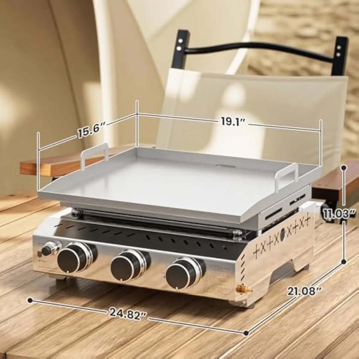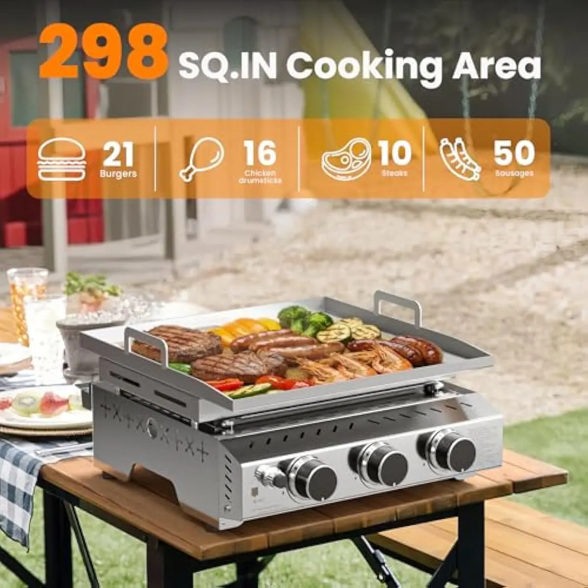 Portable and Versatile: The propane griddle is portable and easy to store, with a cooking area of 298 sq. in. (19.1 in. x 15.6 in.), providing ample space for cooking. Suitable for a wide range of uses, including tailgating, camping, RV trips, and backyard barbecues.