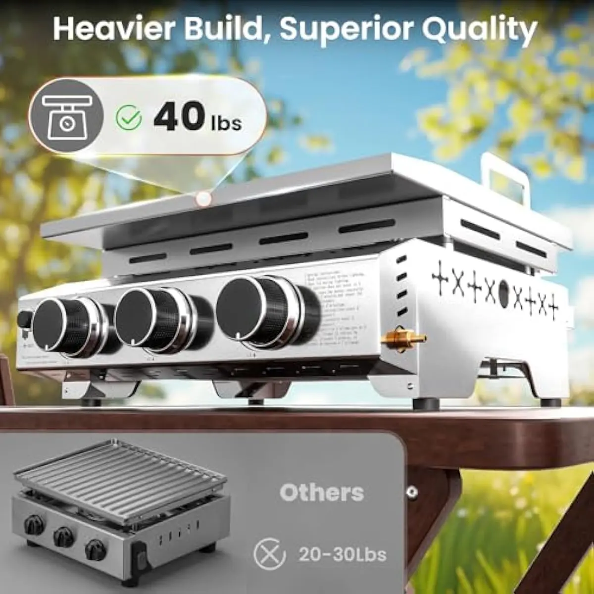 Premium Stainless-Steel Build for Lasting Performance: Forged from heavy-gauge SUS304 stainless steel, this 40-pound tabletop grill delivers rust-proof resilience and rock-solid stability that lighter rivals(20-30lbs) cant match, ensuring faster, more even heating and durable outdoor cooking season after season.