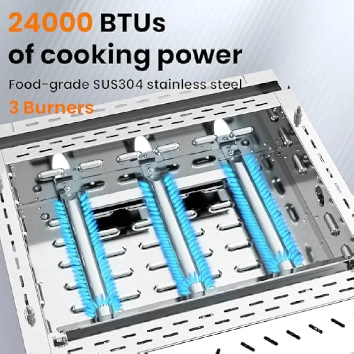 Three Burner Design: This propane grill features 3 independently controlled tubular burners with a total heat output of 24,000 BTUs, which provides reliable and consistent heat for efficiently grilling your favorite foods.