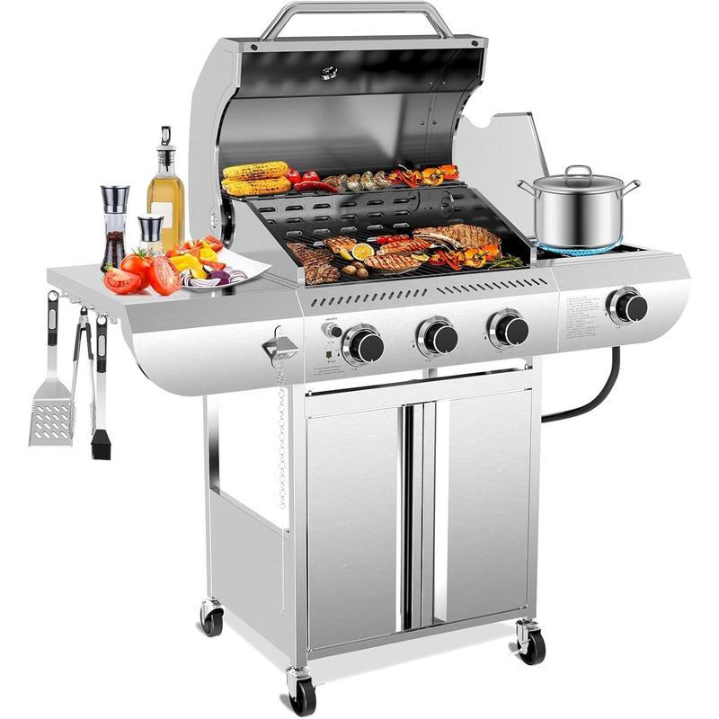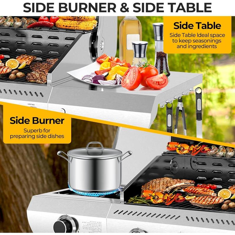 Professional Grade Outdoor Grill : Ideal for backyard, camping or picnics. Includes electronic ignition, side burners for adding more cooking options.