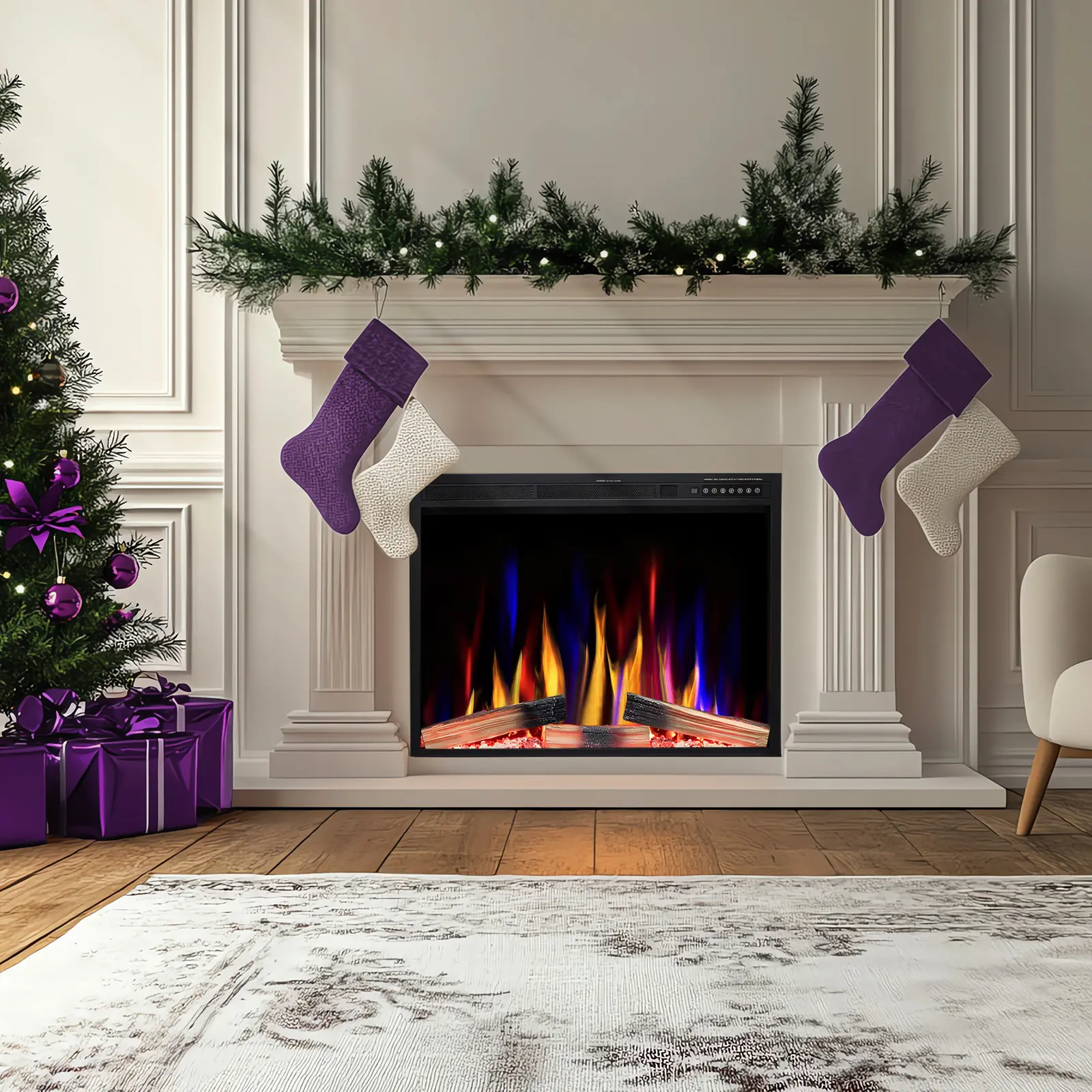 【Electric Fireplace with MULTIPLE OPERATING MODES】: Touch screen on the front panel; Multiple flame and burning log color modes; 5 flame speed modes; 5 flame brightness levels; Specially automatic design (the flame color and brightness change automatically); 1 hour to 8 hours timer control; 8m remote control operating distance; Sleep mode with all lights down while heating【Electric Fireplace Inserts DIMENSIONS】: Freestanding and Recessed Fireplace. Easy to install and ideal for all kinds of occasions such as home, office, or anywhere heat and ambiance are needed. Adjustable Temperature from 50°F to 99°F.Uses 120V【Fireplace with FASHION DESIGN】: Constructed with 7mm thick tempered glass and a black finish, coordinated with gorgeous realistic dancing flames and burning log effect. Give your room a dreamlike ambiance【Electric Fireplace Heater with 2 HEAT SETTINGS AND ENERGY SAVINGS】: 750W & 1500W for different rooms and weather conditions which can be adjusted accordingly for both warmth and energy-saving purposes. It also has energy-saving LED technology. The supplemental zone heating is for up to 400 square feet. It can be operated with or without heat【Safety】: ETL Certificate Approved. 170cm (about 70in) Power Cable. Wall-mounted fireplace heater with LED fire & ice flame. The heat is good for maintaining the natural humidity within the air without making the room too dry