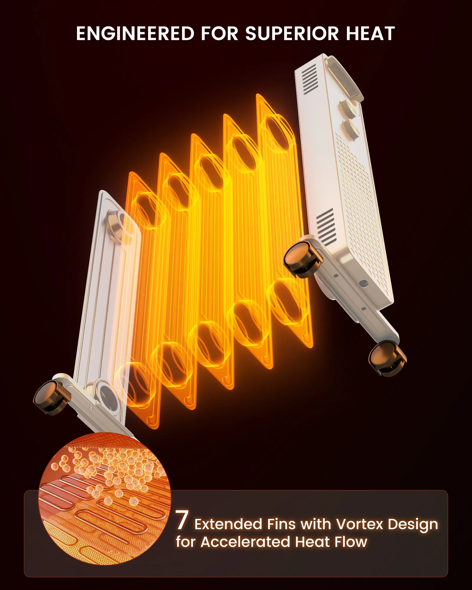 R.W.FLAME Oil Filled Radiator Heater,1500W Portable Electric with 3 Settings Adjustable Thermostat, Overheat Protection ,Quiet for Indoor Bedroom,Office, Wheels Handle Mobility, 7 Fins