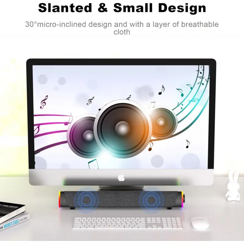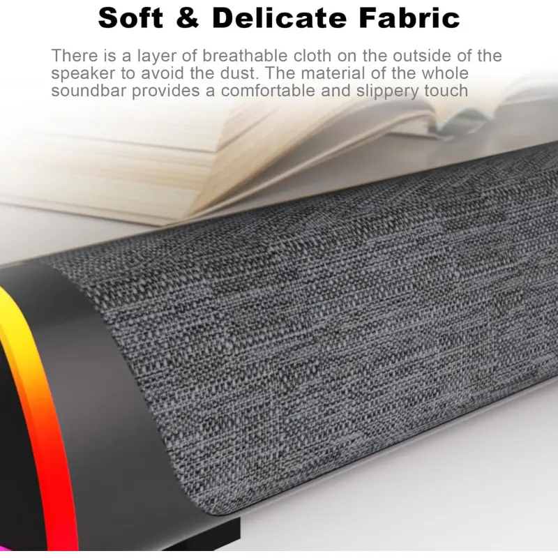 Slanted Design: The 30-degree micro-inclined design allows the sound to be better conveyed.There is a layer of breathable cloth on the outside of the speaker to avoid the dust.The material of the whole soundbar provides a comfortable and slippery touch