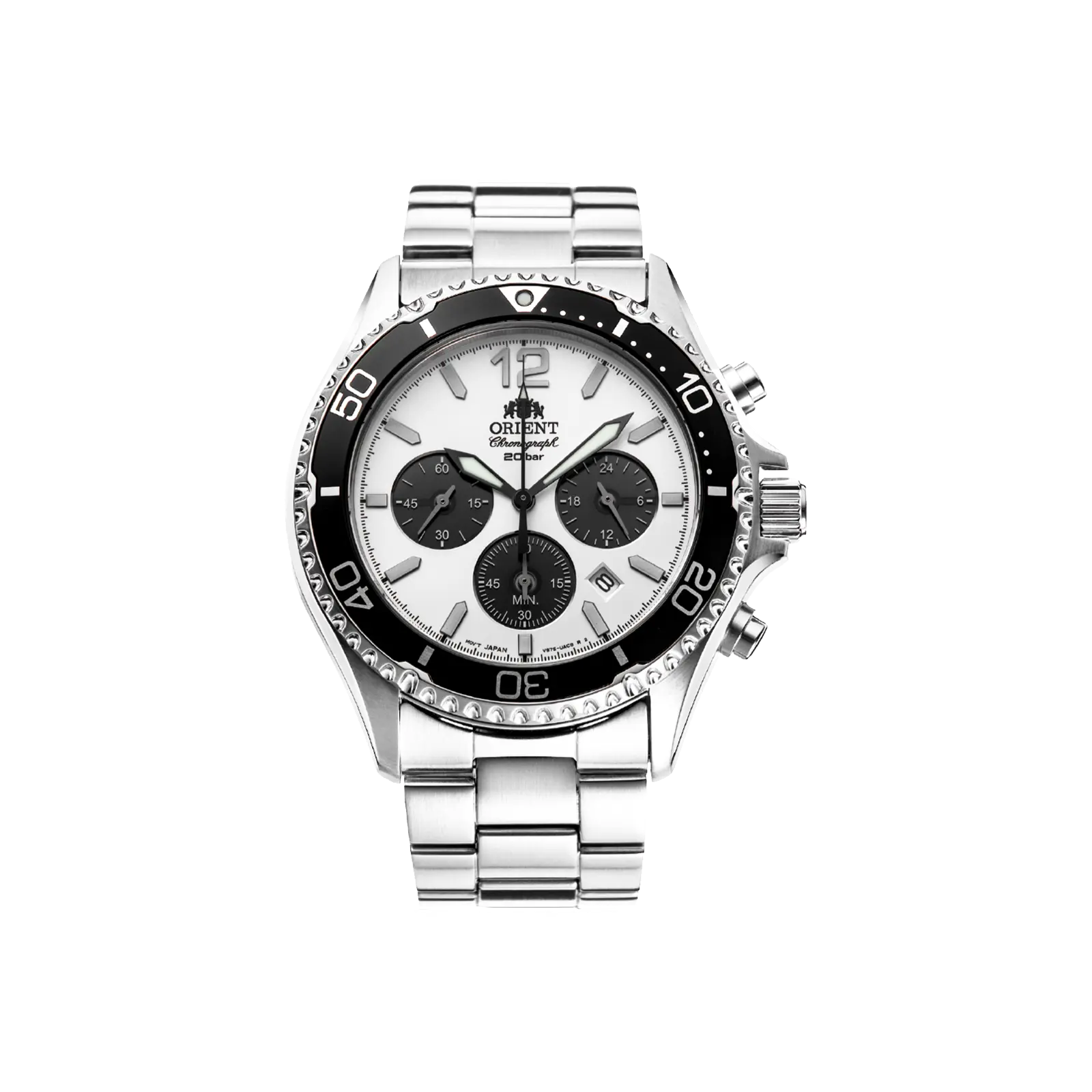 The Orient RA-TX02 features a VS752 caliber solar quartz chronograph movement. It offers a power reserve of approximately 6 months. The sapphire crystal ensures durability and clarity. The white dial complements the stainless steel case, measuring 42.8 mm without the crown.