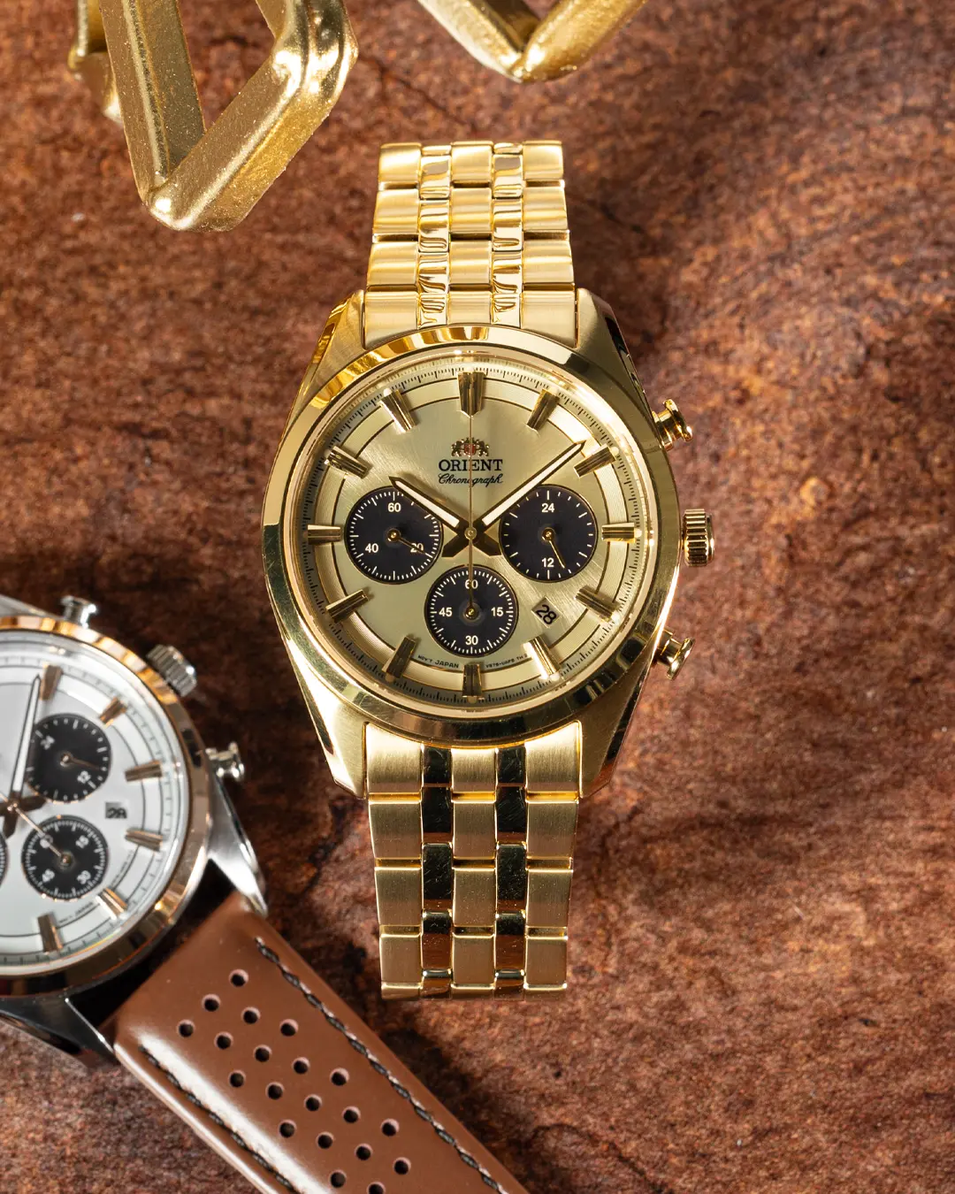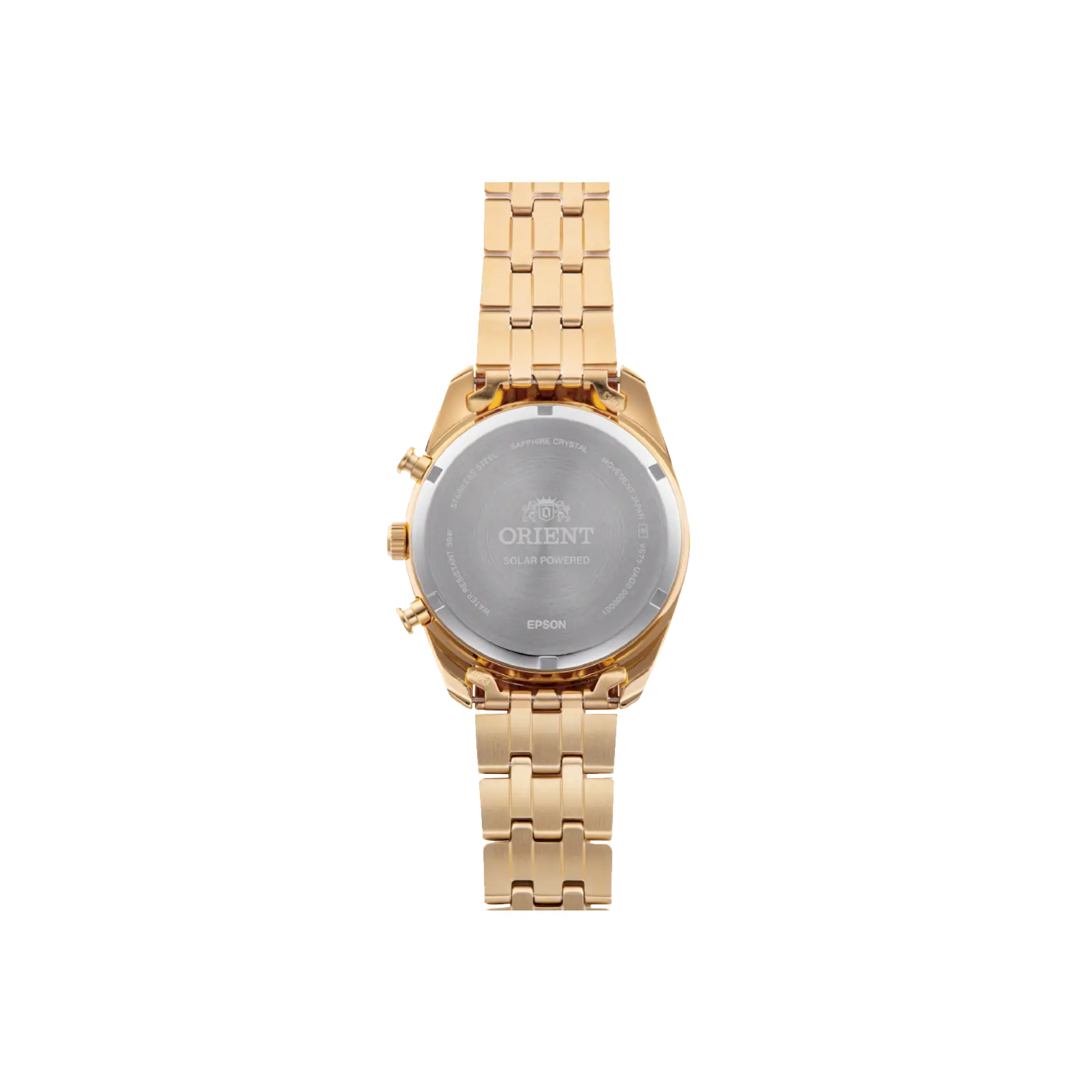 The Orient Stretto features a VS752 Caliber Solar Quartz Chronograph movement. It offers a power reserve of approximately 6 months. The watch boasts a champagne dial and a sapphire crystal for durability. The stainless steel case measures 40 mm in diameter, with a thickness of 13 mm. It's water-resistant up to 50 m. This chronograph is perfect for those who appreciate precision and style.