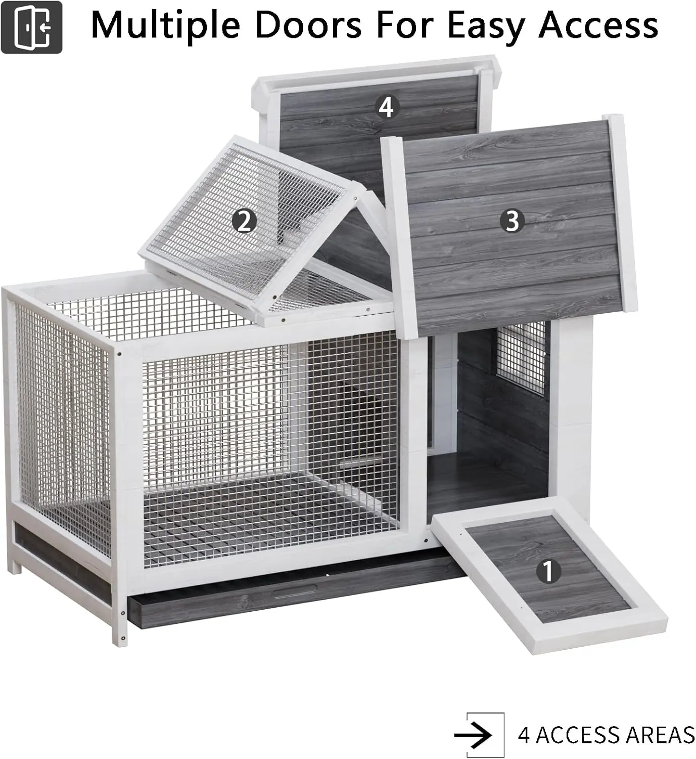 【Easy to Clean and Use】 Our wooden bunny hutch features lockable entry doors and a removable pull-out tray, making it easy to clean. Unlike other ordinary rabbit hutch, our wooden rabbit cage’s trays do not leak, and we have added a locking mechanism to prevent the tray from accidentally falling out. You can use the included cleaning brush for more effective cleaning, ensuring a safe and warm environment for your pets.
