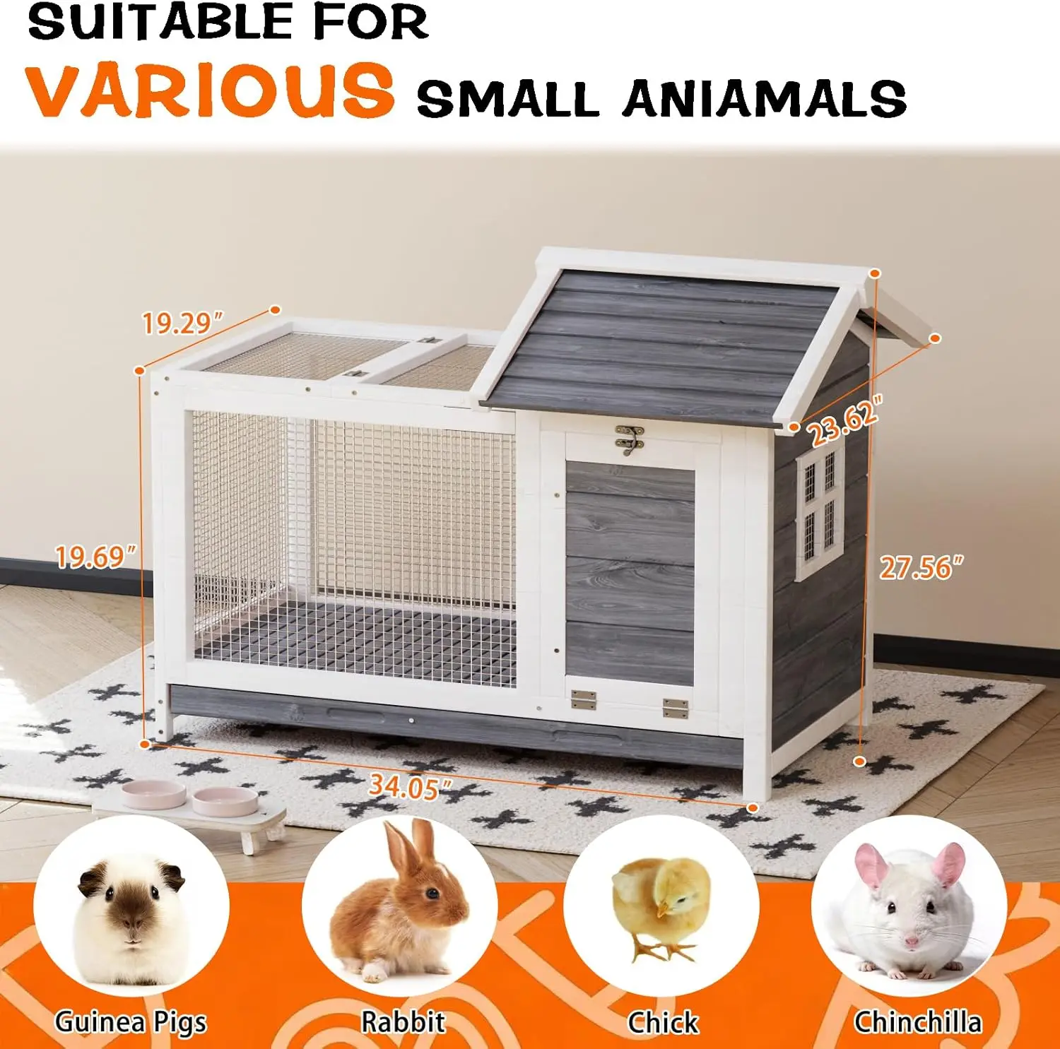 【Sturdy & Weatherproof】 Crafted from Fir wood, roof is made of asphalt, featuring the rabbit house with enough resistance against sun and rain and add anti-bite strips at the ramp frams prevent damage from animals. Rabbit hutch can be used as a habitat for small pets such as rabbits, ducks, chicken, cats, guinea pigs, hamsters, quail, chinchillas, gerbils and other small animals.