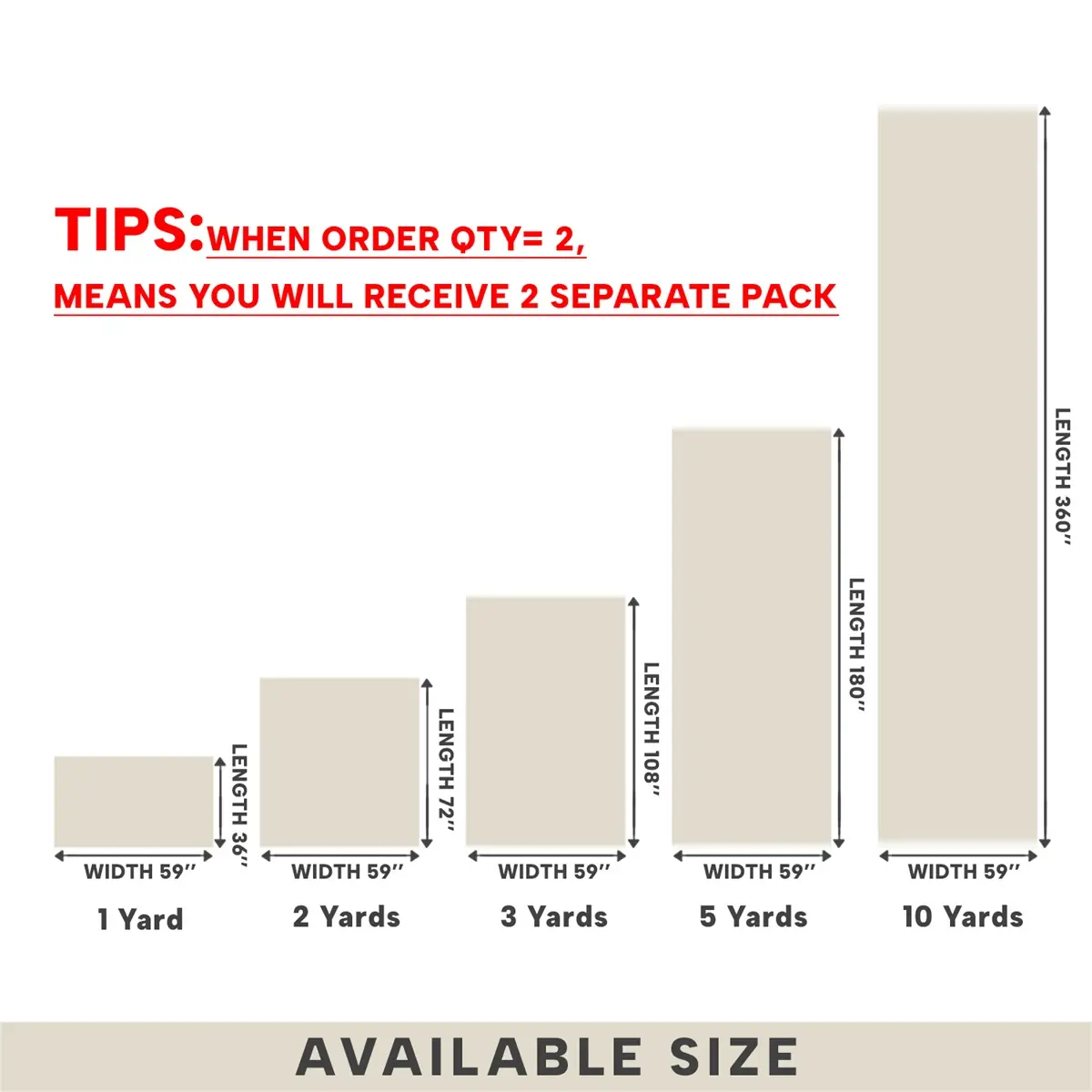 Length 36" 1 yard x width 58" every 1 qty equal to 1 yard;Each quantity is cut in separate pieces as a continuous 1 yard of fabric each;