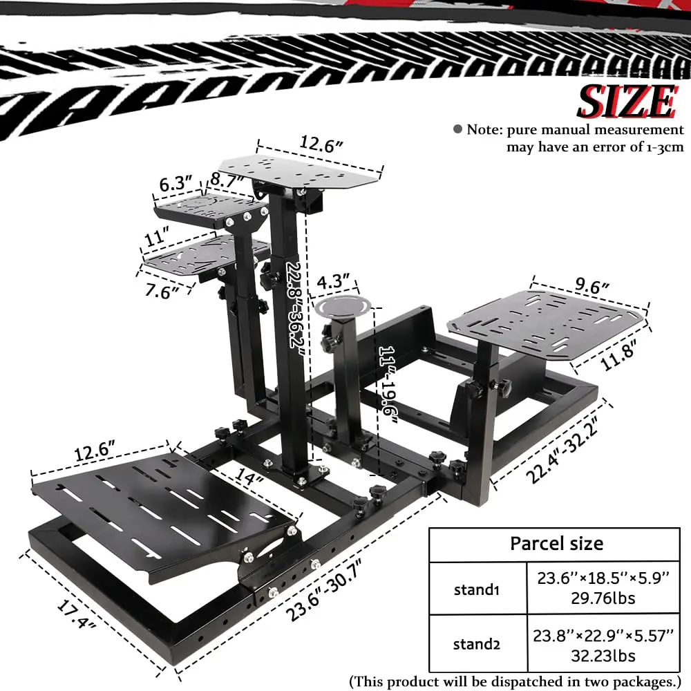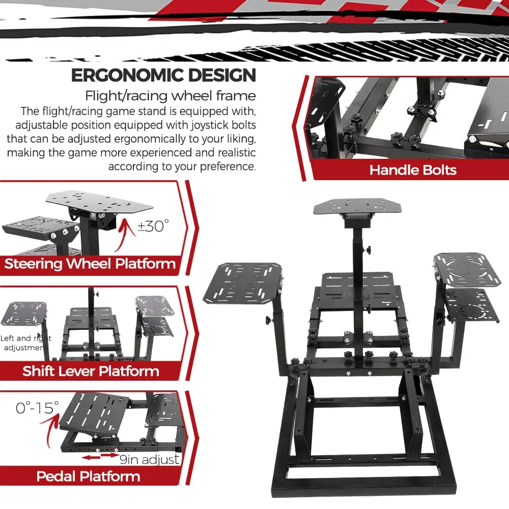 【Super Adjustability】Racing stand doesn't fit? Come and try this product! You can adjust: stand height and length / panel orientation and position / pedal angle and position.