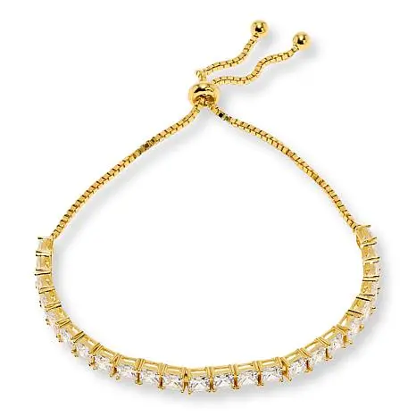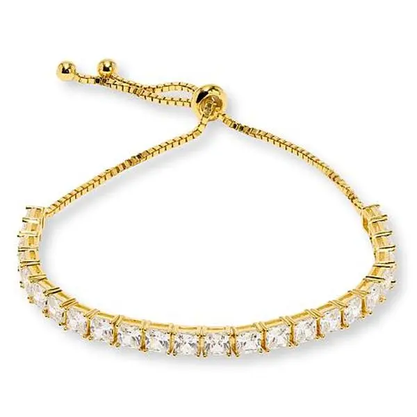 Radiance by Absolute™ 4mm Princess Cut Adjustable Tennis Bolo Bracelet Discover the perfect blend of sparkle and versatility with this adjustable tennis bolo bracelet. Its sleek design and princess-cut stones add a modern touch to any outfit, while the easy slide clasp lets you customize the fit from 5" to 9". Whether layered or worn solo, it’s a dazzling addition to your jewelry collection. Adjustable length from 5" to 9" Stamped .925 sterling silver with goldtone or silver-tone Polished surface finish with a box chain style Slide clasp for easy adjustment Stone Information All sizes and weights, including diamond equivalent weights (DE), are approximate Total Carat Weight: 14.50ctw, 8.8 ctw (DE) White princess-cut Absolute simulated diamond CZ stones, 4x4 mm each