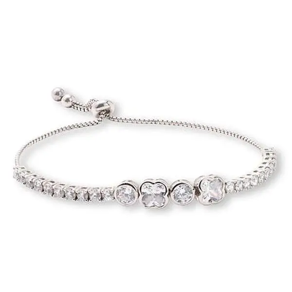 Radiance by Absolute™ Bezel XOXO Tennis Bolo Bracelet Put a playful twist on sparkle with this bezel-set XOXO tennis bolo bracelet. The half tennis-style, half box chain design offers adjustable comfort and a chic look that pairs perfectly with your everyday style. Whether dressing up or down, this bracelet adds a subtle shimmer that’s sure to catch the eye. Adjustable bolo-style closure opens to a maximum of 9" Recommended for wrists sized 6-1/4" to 8" 925 sterling silver with silver-tone plating and polished finish Box chain style with no clasp Stone Information Total cubic zirconia weight approx. 8.00 cttw, total diamond equivalent weight approx. 5.00 cttw Man-made CZ simulated stones in geometric quatrefoil, round 5.0 mm and round 3.0 mm cuts All sizes and weights, including diamond equivalent weights (DE), are approximate