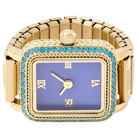 Radiance by Absolute™ Goldtone Rectangle Dial Ring Watch Discover the elegant charm of this rectangle ring watch, featuring a polished goldtone ion-plated finish and a comfortable expansion slip-on band. Its mother of pearl dial is beautifully accented with sparkling stones on the bezel, making it a stylish choice for everyday wear or special occasions. The water-resistant design adds durability, so you can wear it with confidence wherever life takes you. Choice of White, Green, or Blue mother of pearl dial with matching-color stones on bezel S/M (ring sizes 5-7) or M/L (ring sizes 7-9) Case measures approximately 7/8" L x 3/4" W x 1/4" H Expansion link band, slip-on style Polished goldtone Roman numeral hour markers Quartz movement with stainless steel serrated stem Water resistant up to 3 ATM Stone Information Natural mother of pearl disc stones approx. 13.0 x 15.0 mm Man-made CZ simulated diamond round stones approx. 1.0 mm Total carat weight 0.47 ctw, 0.27 ctw (DE) All sizes and weights, including diamond equivalent weights (DE), are approximate