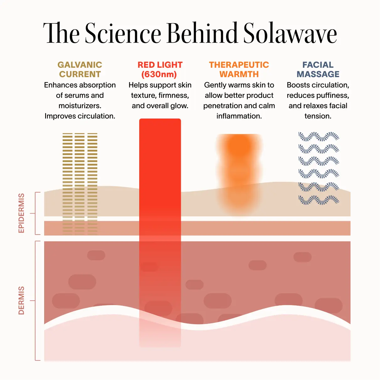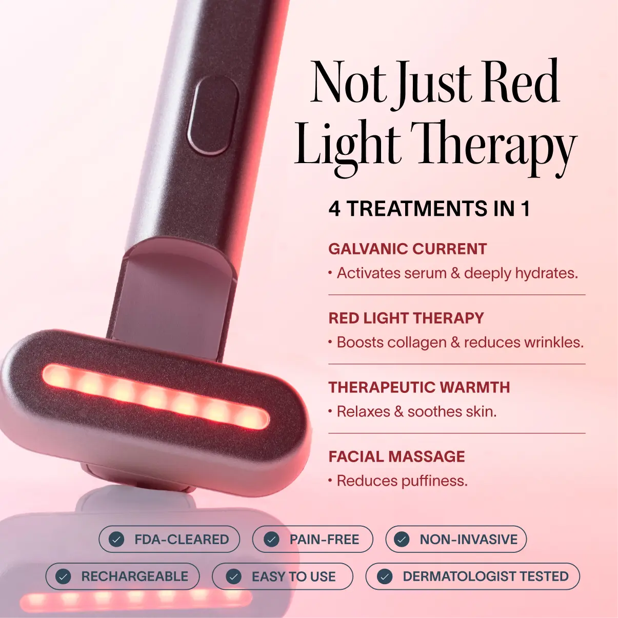 ·4-in-1 technology: Red Light, Galvanic Current, Therapeutic Warmth, Facial Massage.
