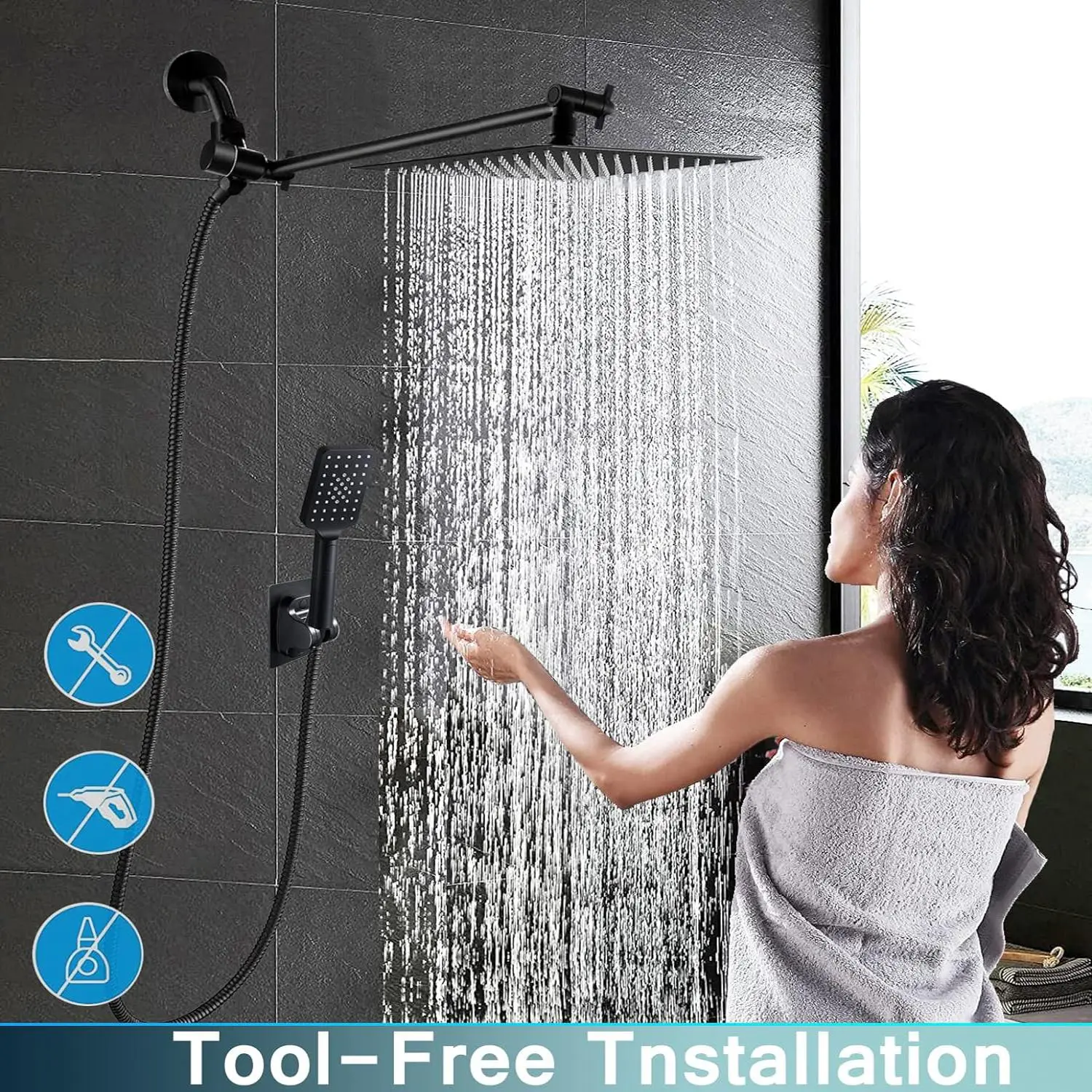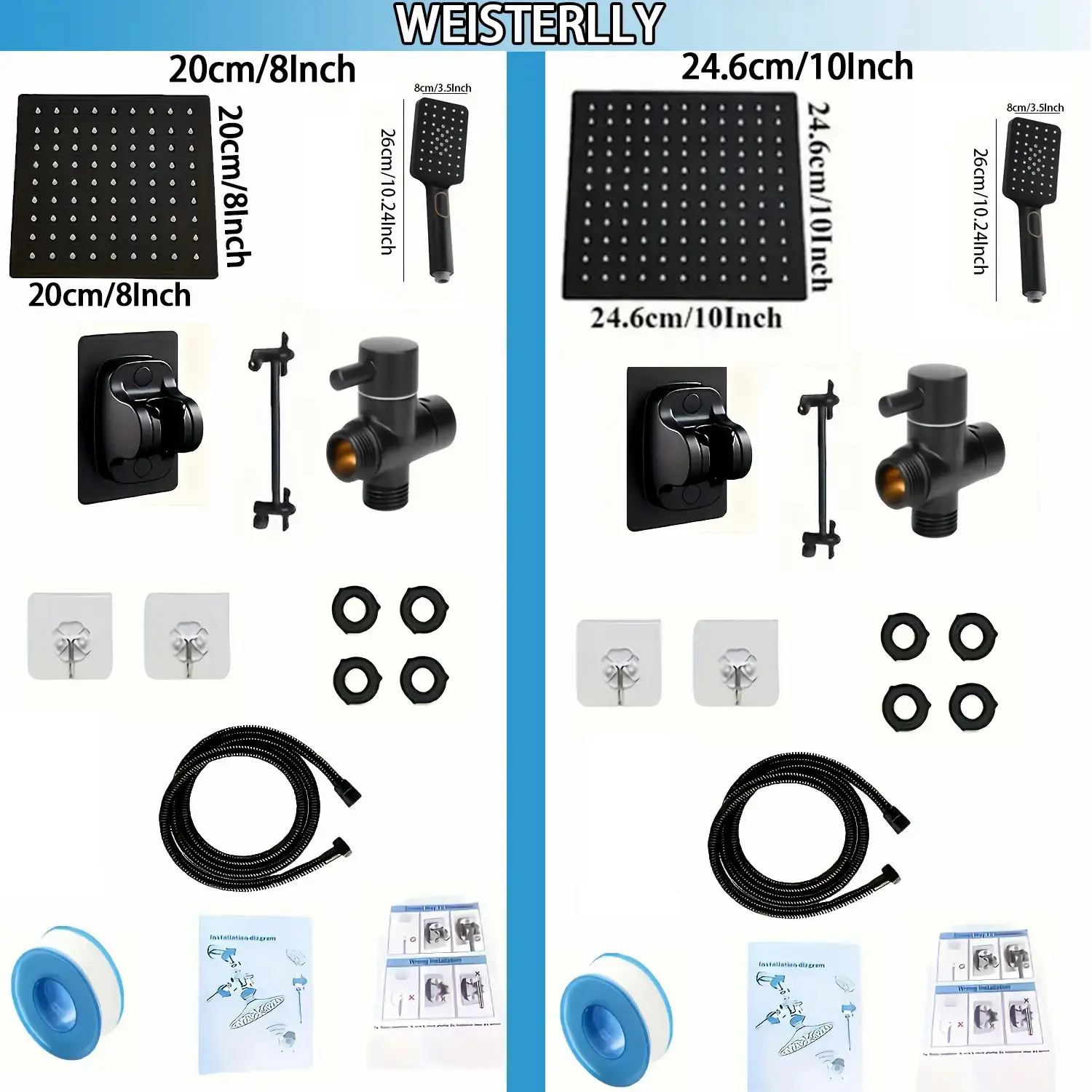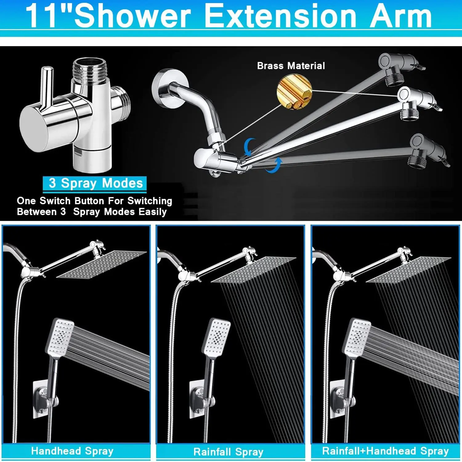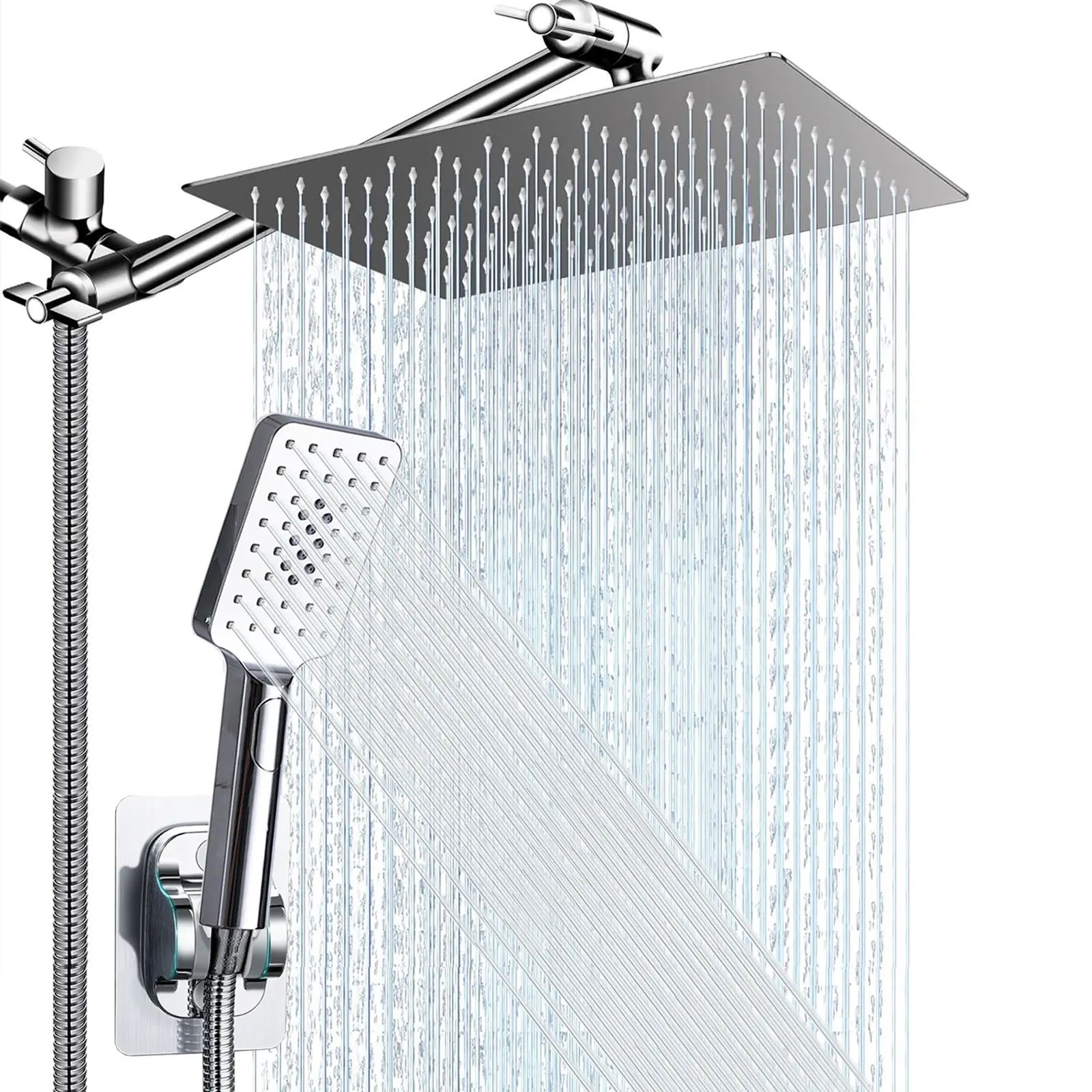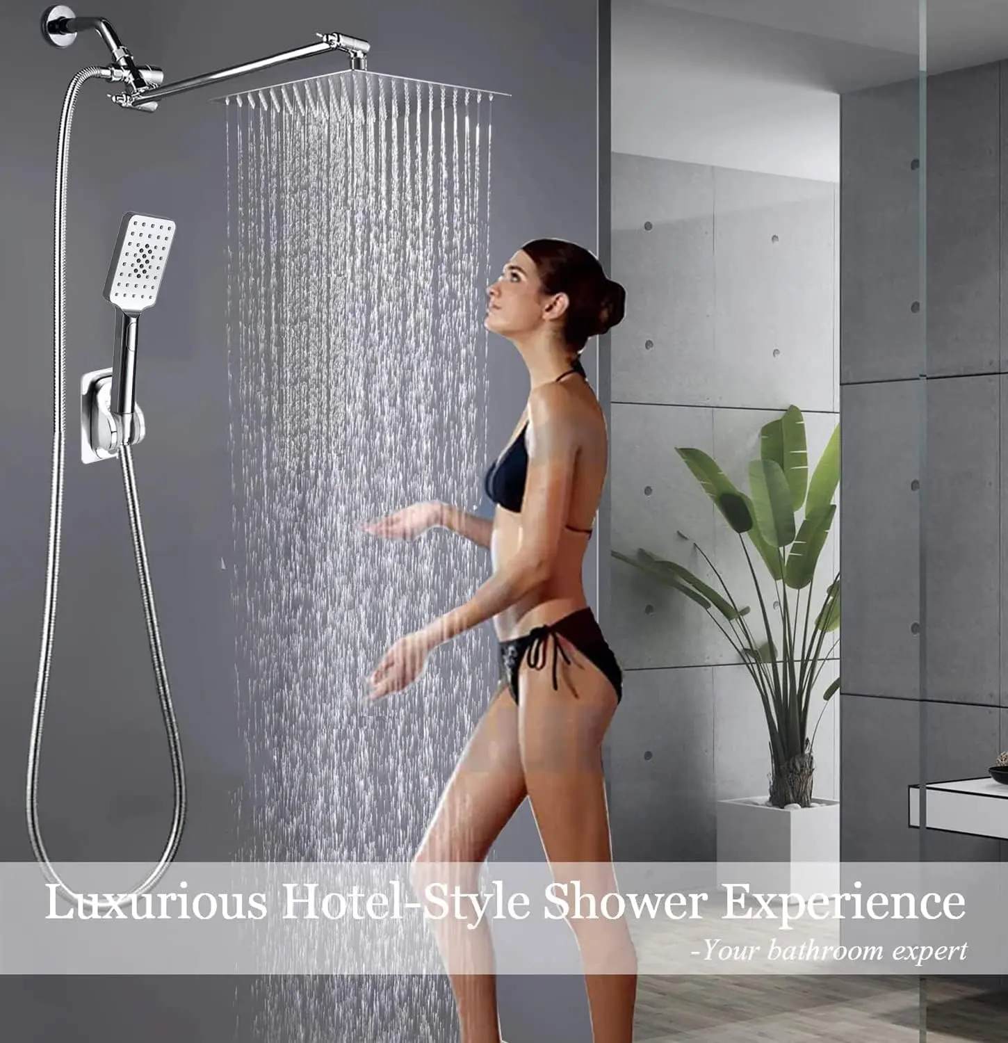 [Rainfall Shower Head Combo] - California Compliant. 10’’ Large Square Rainfall Showerhead, chrome Face Handheld Shower, 78’’ Stainless Steel Hose, 11''Shower Extension Arm, 3 Way Diverter, Strong Suction Cup Shower Bracket, Teflon Tape, installation manual and warranty .