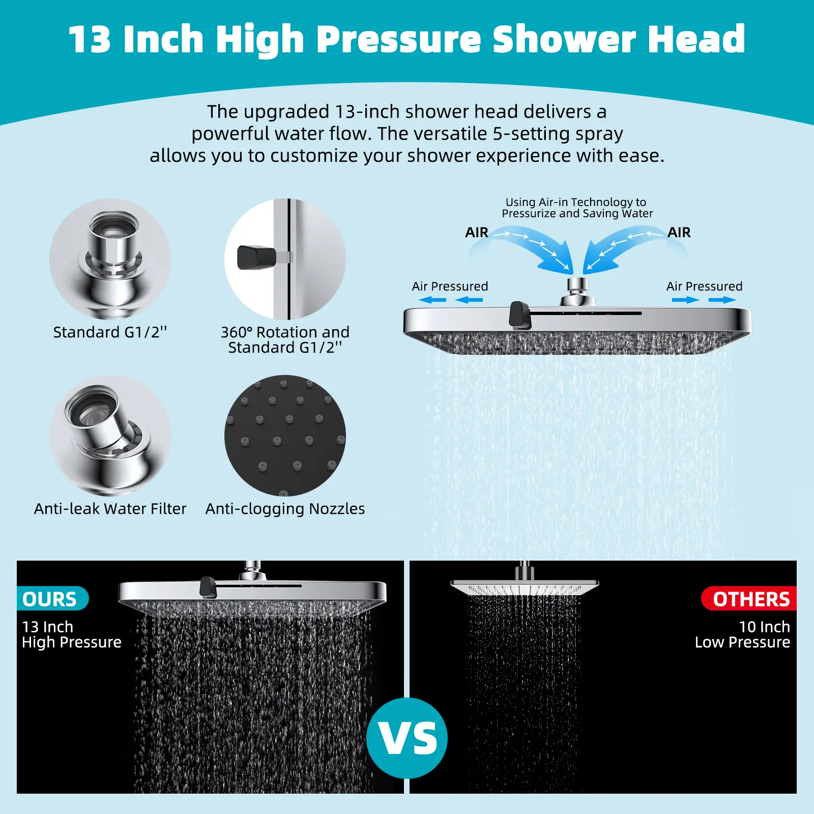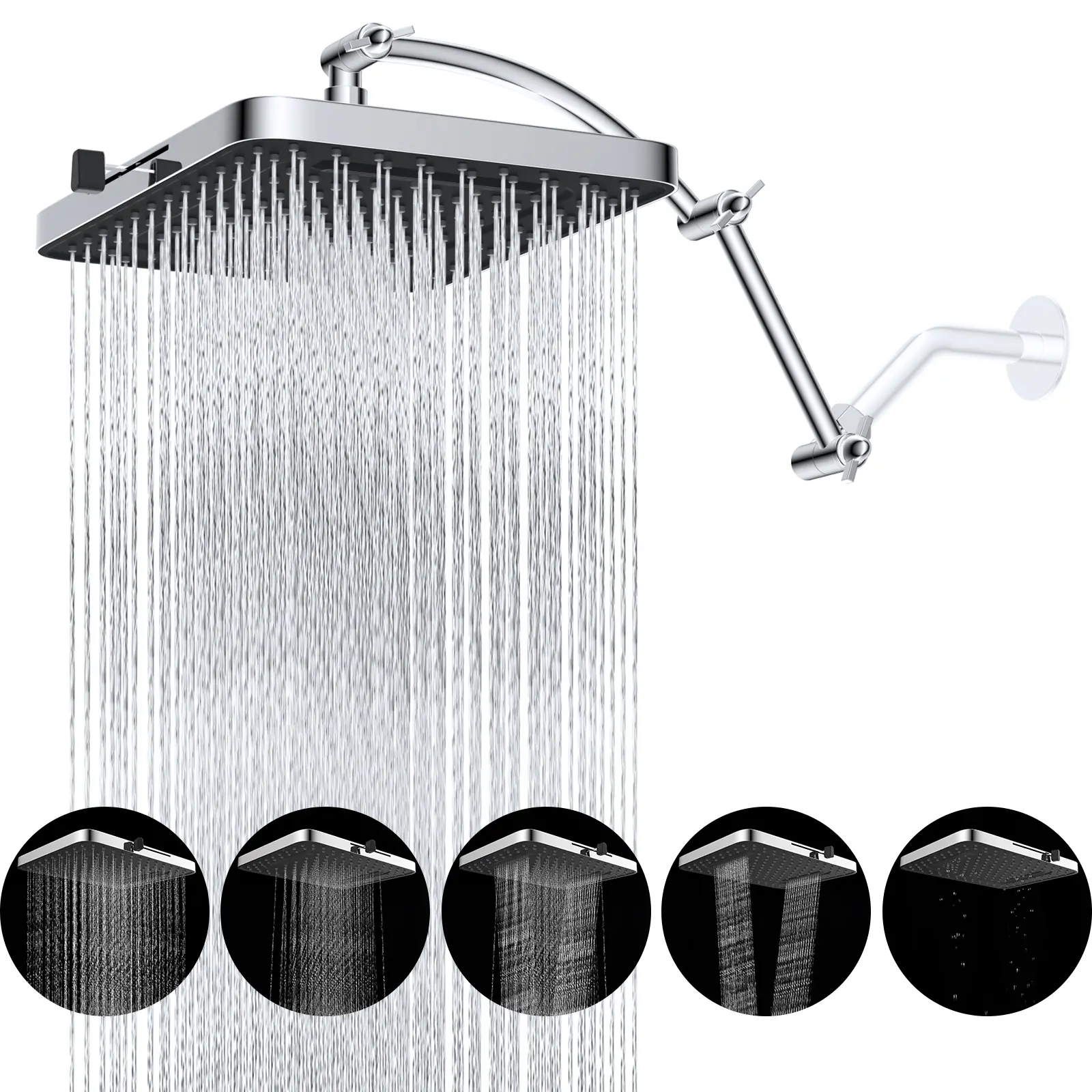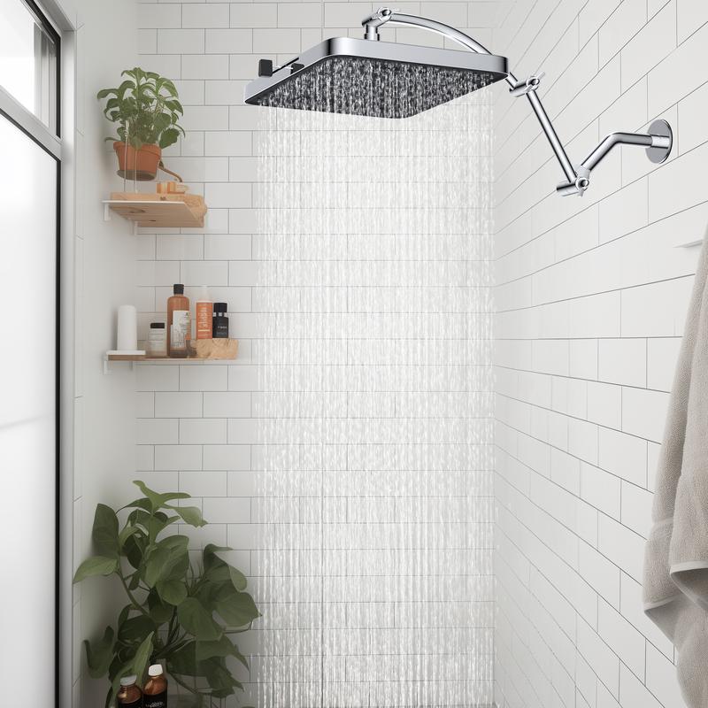 ·Upgraded Rainfall Shower Head: This 13-inch rain shower head has 157 splash jets that provide a luxurious rain spray that envelops your body with full drops, providing a dynamic high-pressure massage experience even at low water pressure levels. The brass swivel ball connector lets you adjust the shower head to any angle. Versatile 5-setting design enables you to effortlessly transition between 5 sprays to indulge in a comfortable cleansing shower tailored to your every preference