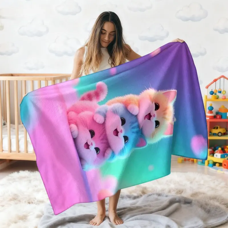Rainbow Three Cats Pattern Blanket, Soft Warm Plush, Cute Cartoon Design, Home Bedroom Essential, Multi-Purpose