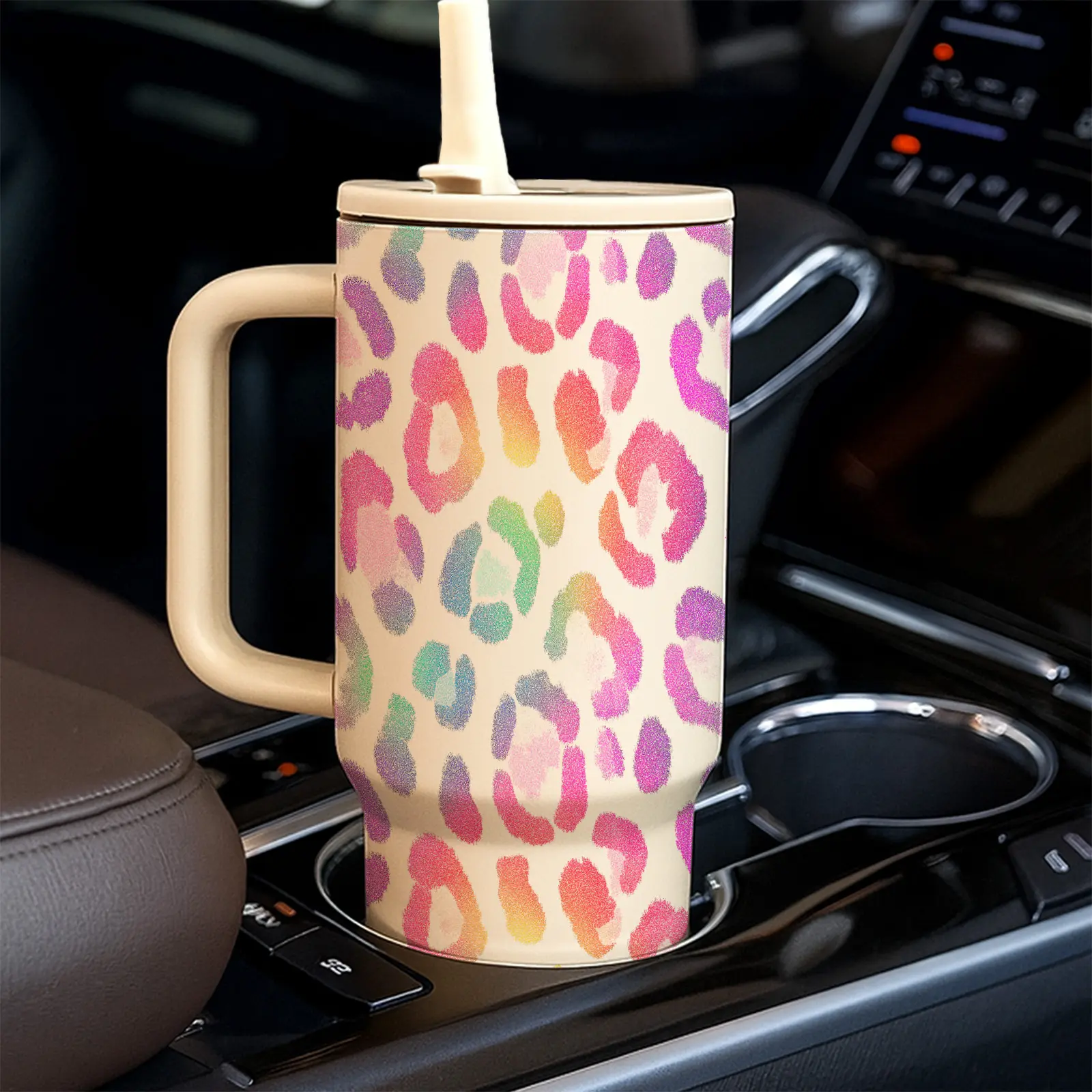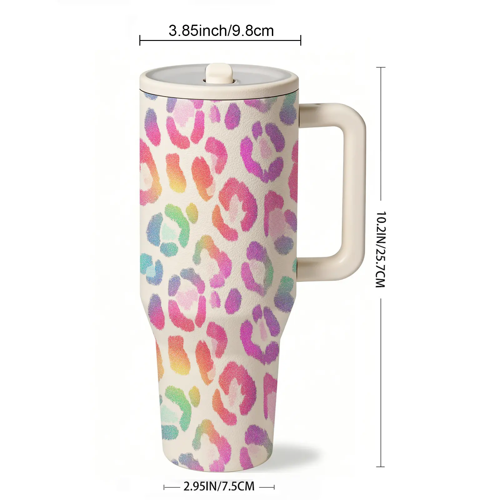 1 Pc Rainbow Leopard Print thermal mug, Vacuum insulated tumbler,40oz with handle, double wall vacuum insulated stainless, leak proof lid, keeps hot 12h cold 24h, for iced coffee tea water, sweat free grip, travel office daily, gift for women men