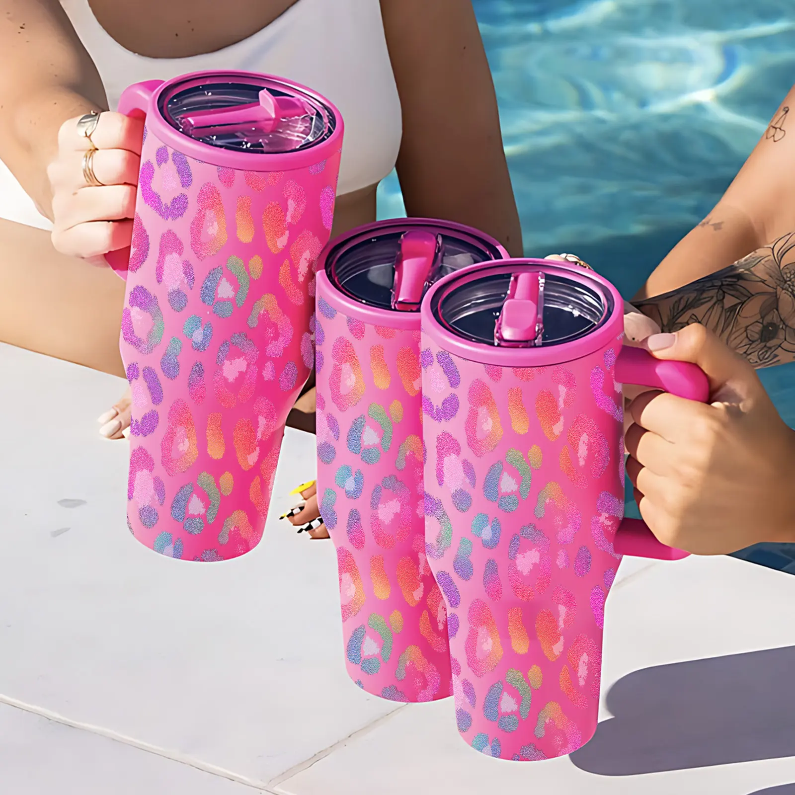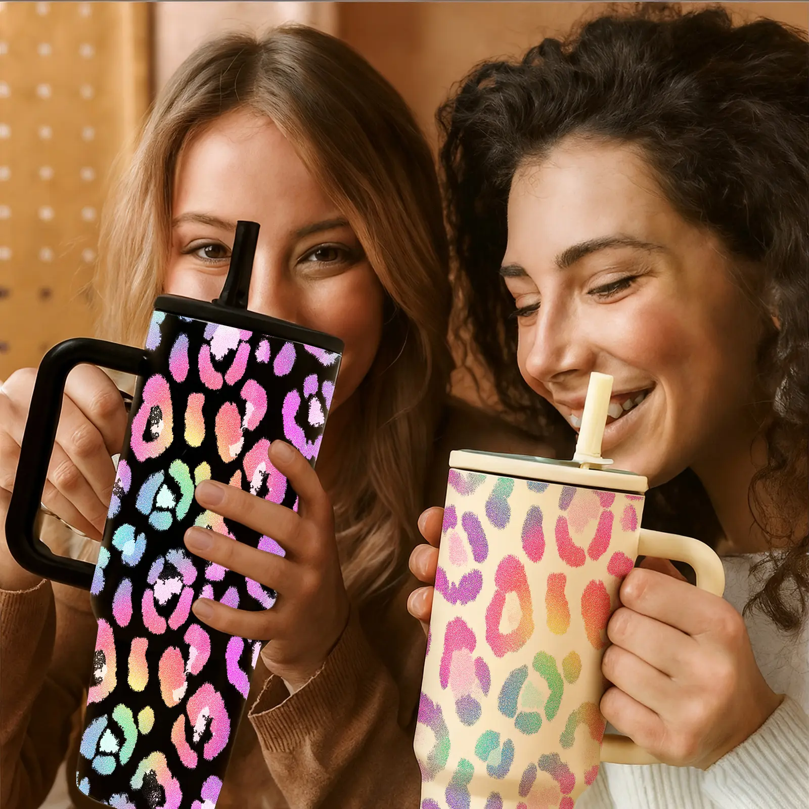 5. 1 Pc Rainbow Leopard Print thermal mug, Vacuum insulated tumbler,40oz with handle, double wall vacuum insulated stainless, leak proof lid, keeps hot 12h cold 24h, for iced coffee tea water, sweat free grip, travel office daily, gift for women men