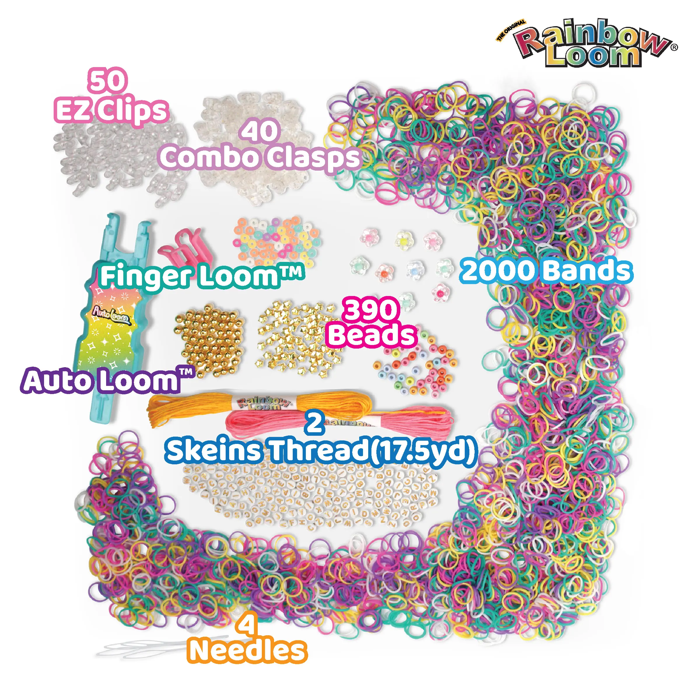 The kit comes with 1 Auto Loom, 1 finger loom, 2000 rubber bands, 390 beads, 40 combo clasps, 50 EZ-clips, 2 skeins embroidery floss, 4 bead needles, and an instruction guide. All tools and materials are designed for creative, personalized bracelet-making. Enjoy crafting endless designs with this comprehensive set!