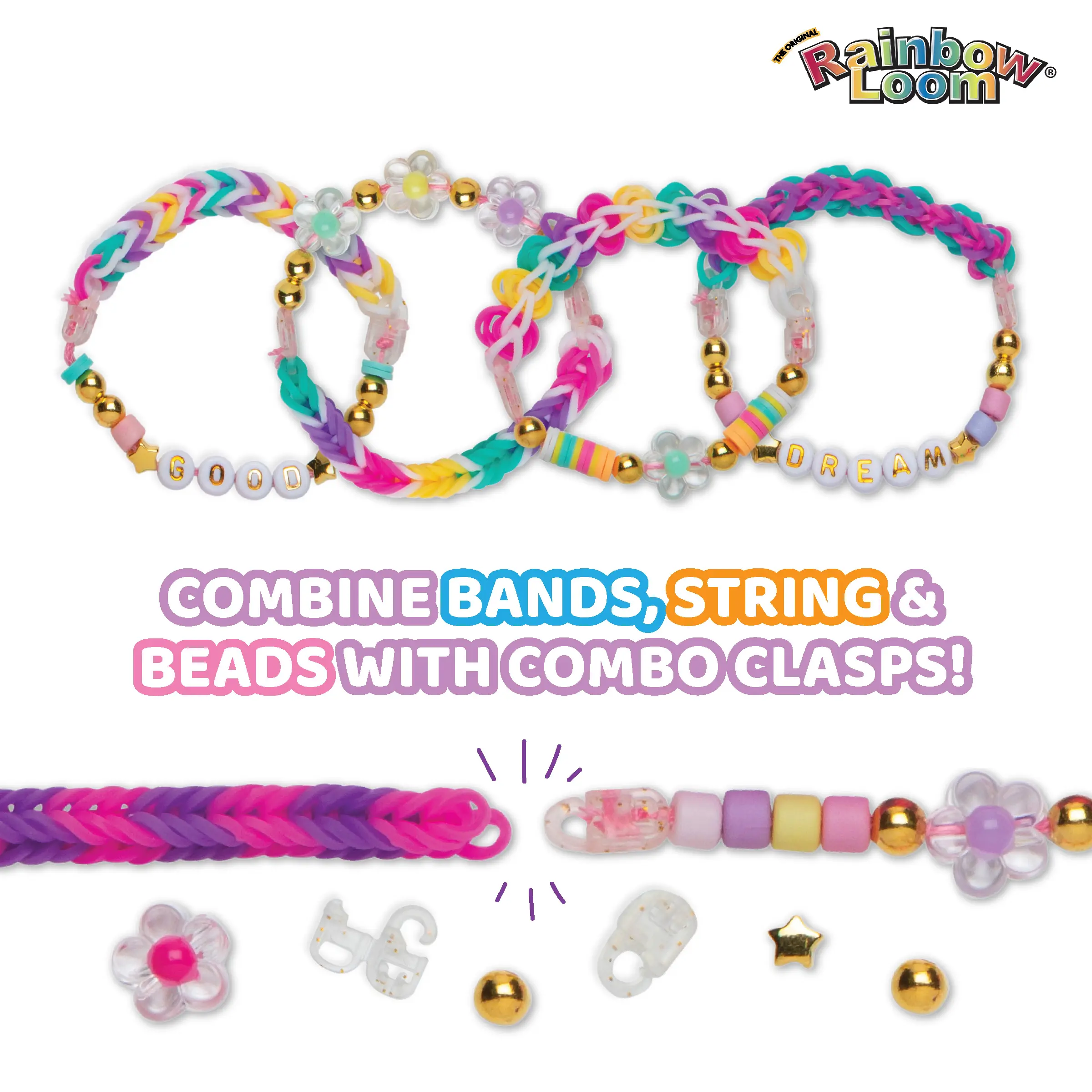 • Combine bands, braids, and beads for amazing designs!• New combo clasps connect braids seamlessly!• Includes Auto Loom for speed and ease!