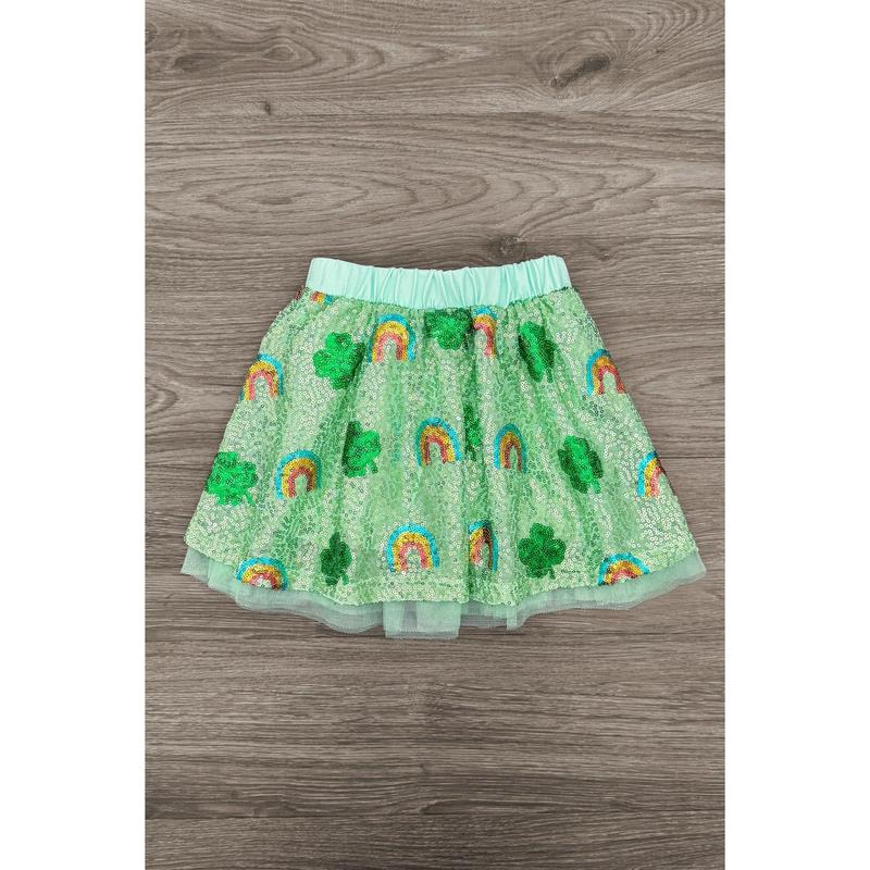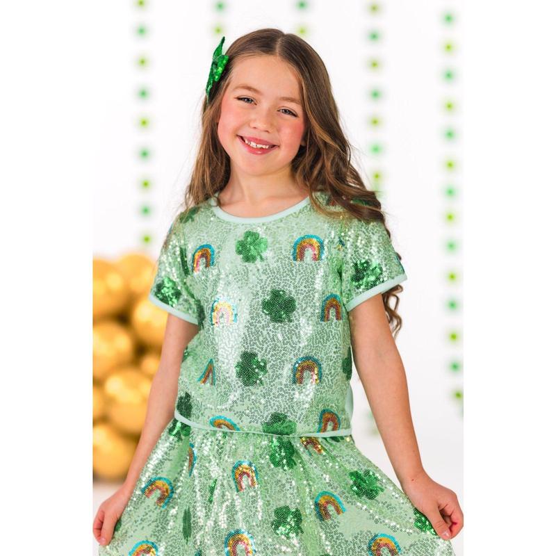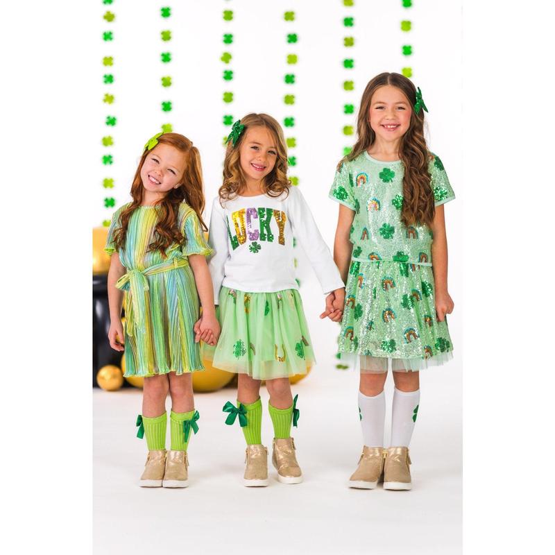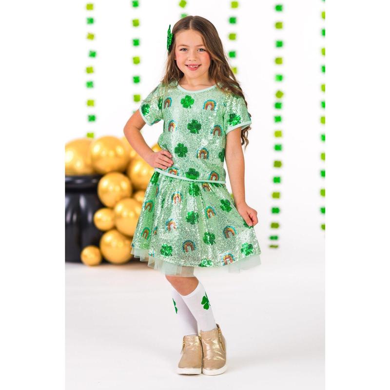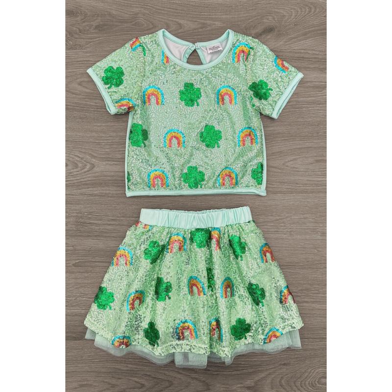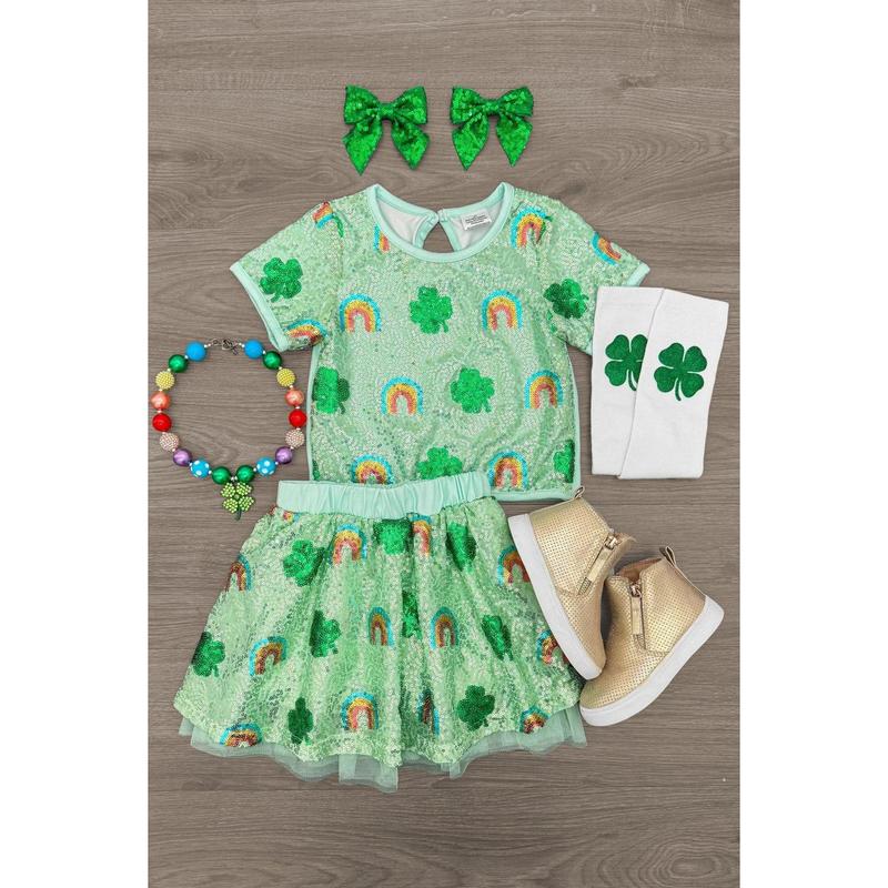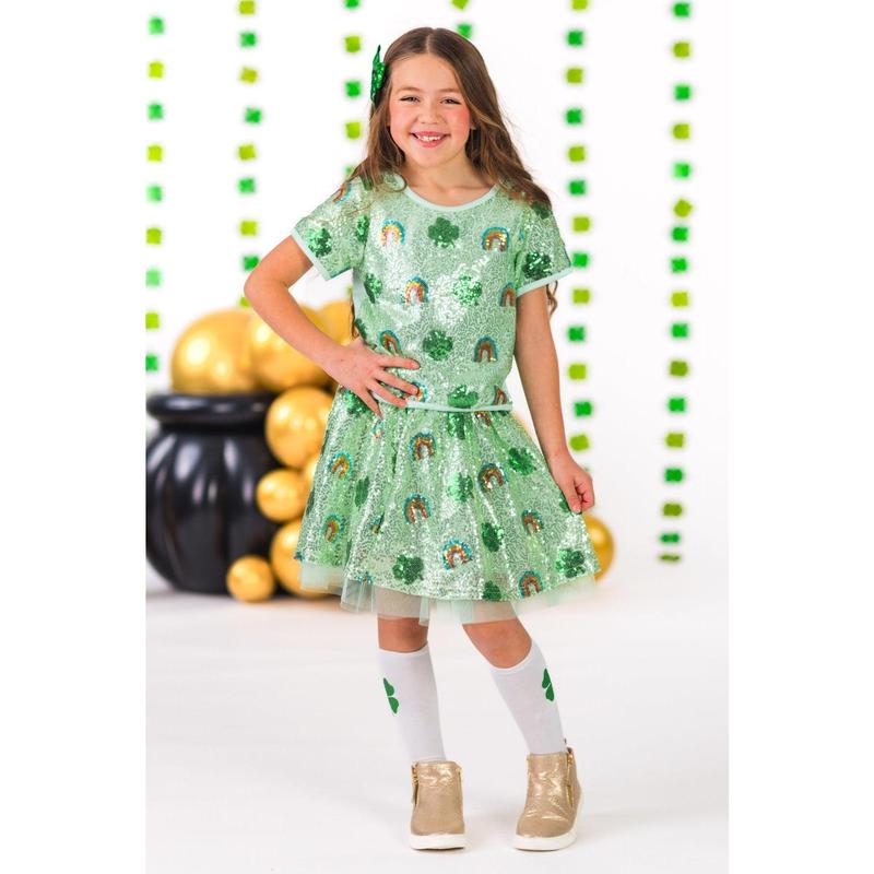 Your lucky little one will look so cute in our in our Rainbow & Shamrock Sequin Skirt Set. The green top features an allover rainbow & shamrock sequin design, and looks adorable paired with the matching skirt. The stretch waistband provides a secure fit and allows for all day comfort, while the festive print adds a sweet touch. She can pair this set with a pair of booties and our bows for the perfect look!