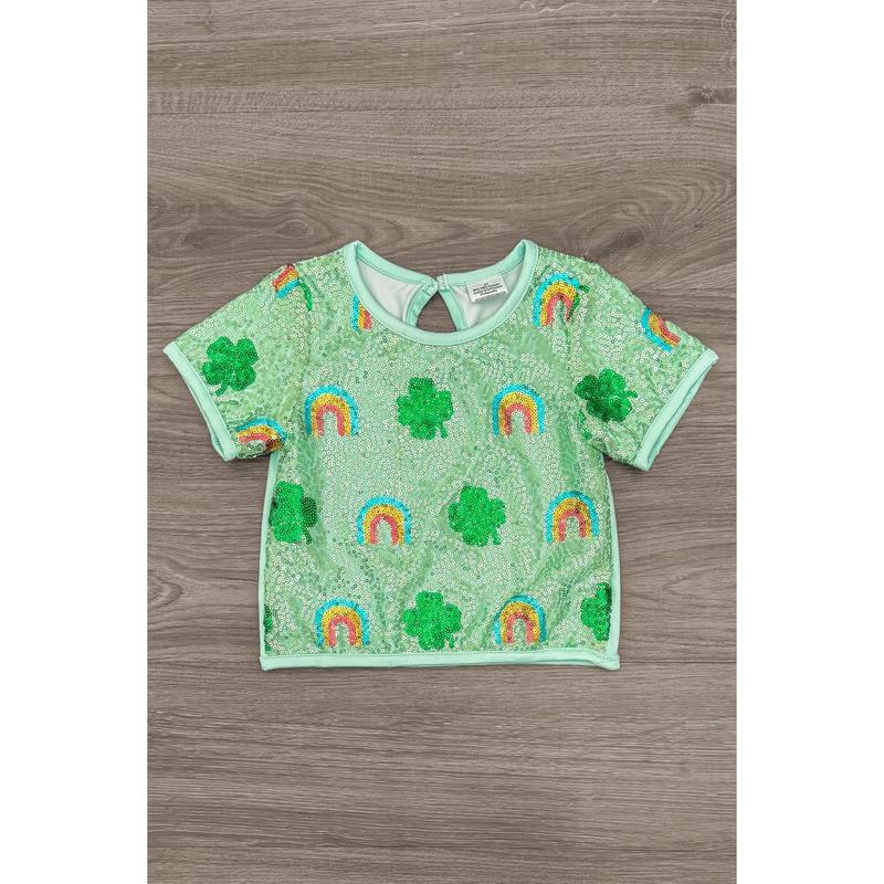 ·Short sleeve top with an allover rainbow & shamrock sequin design