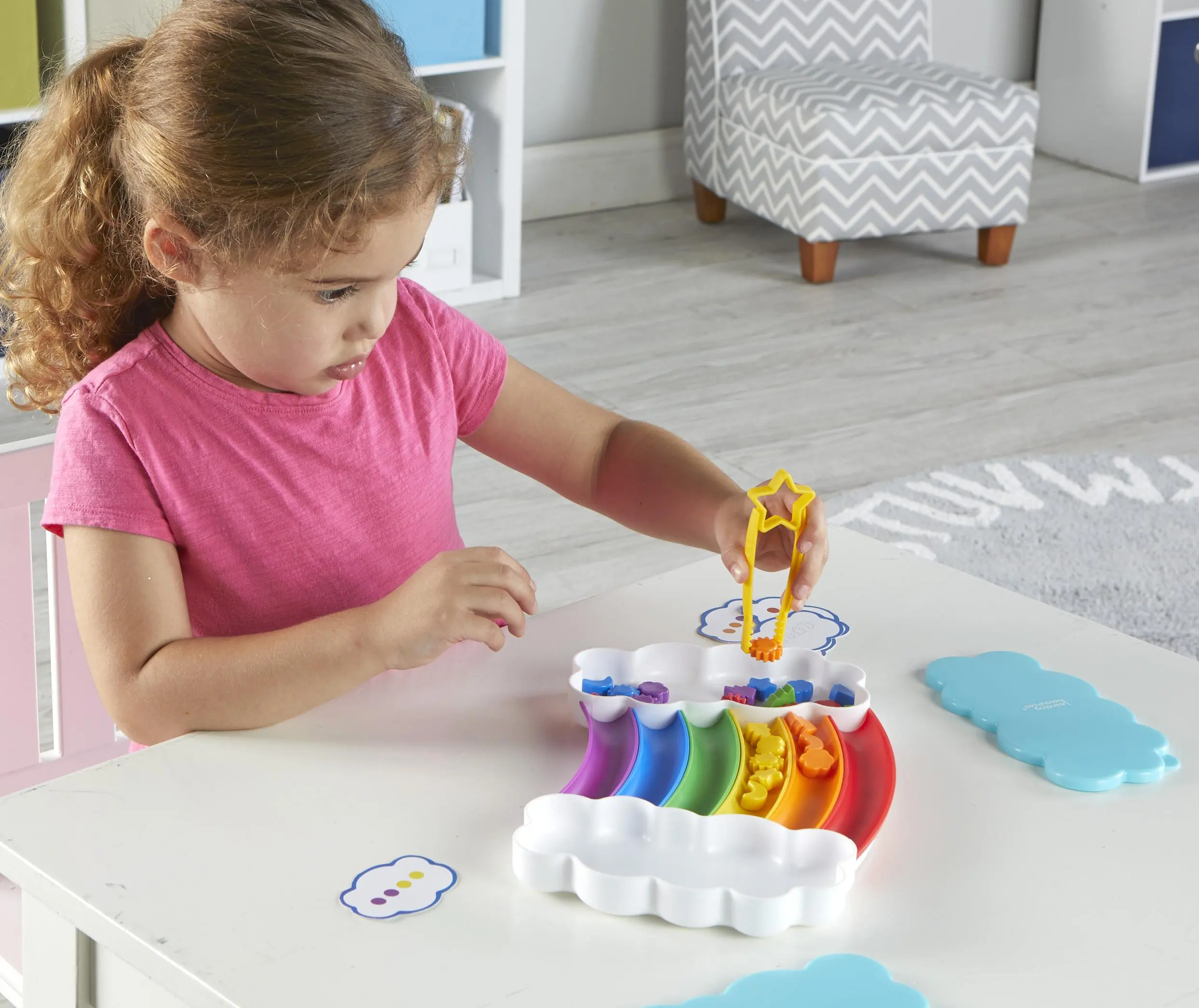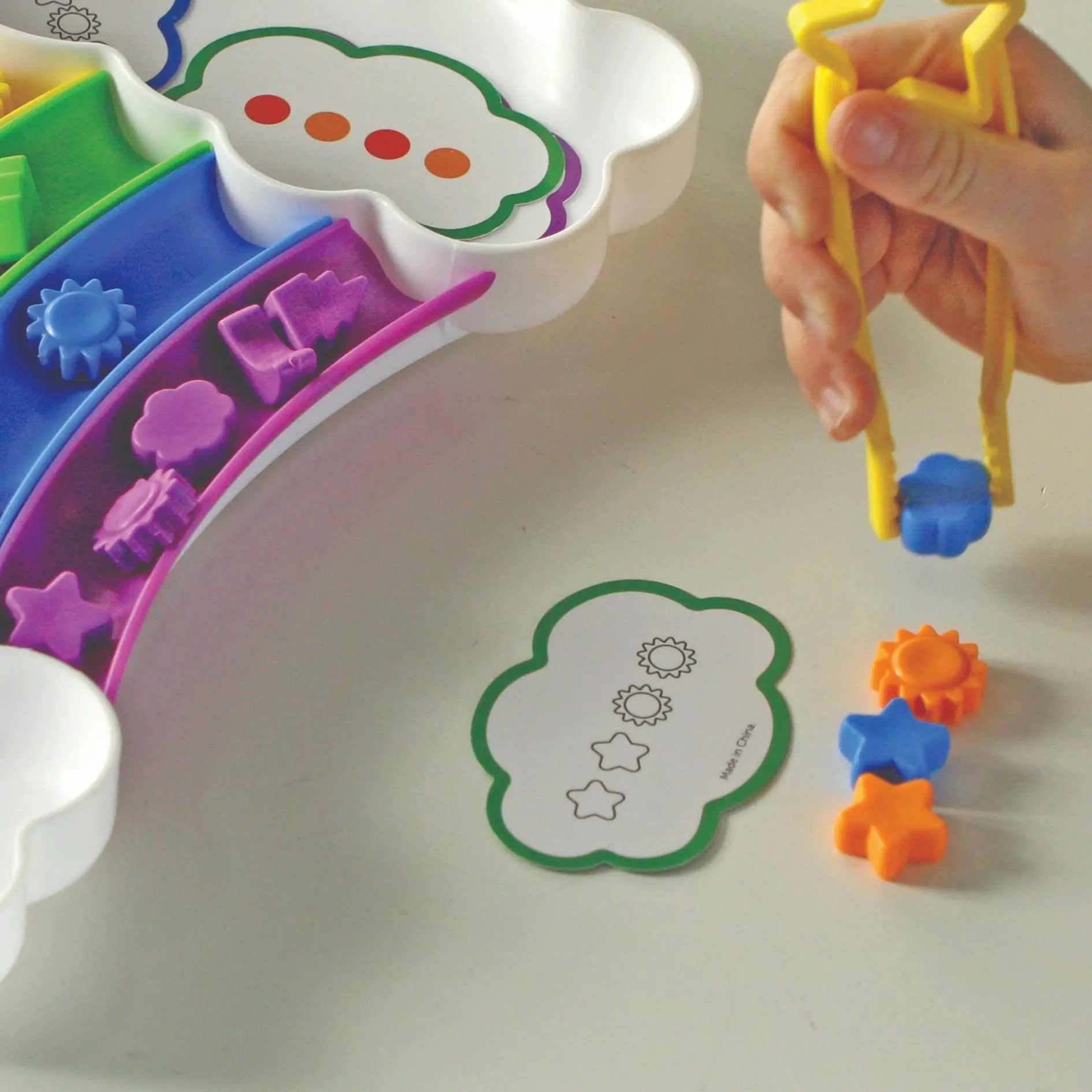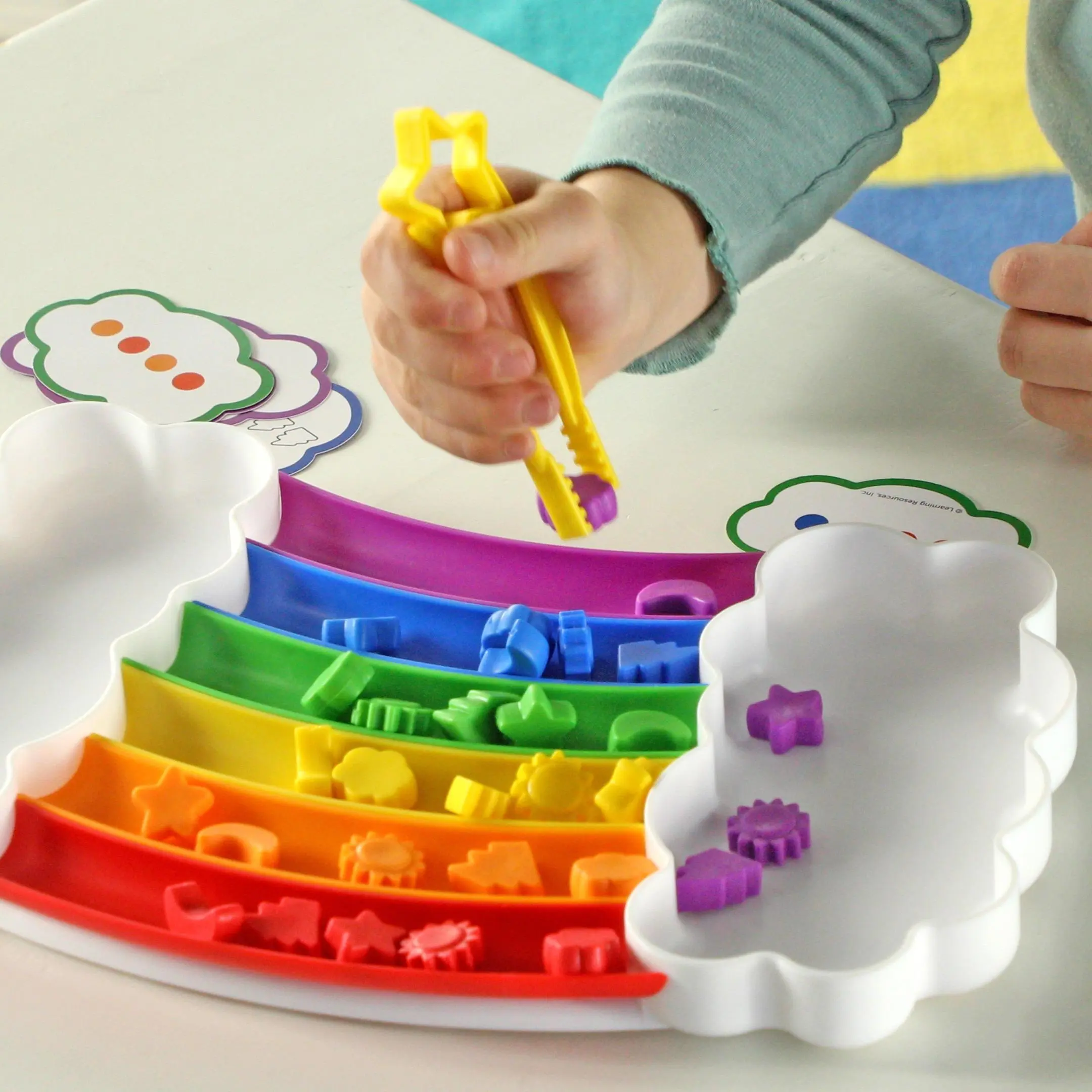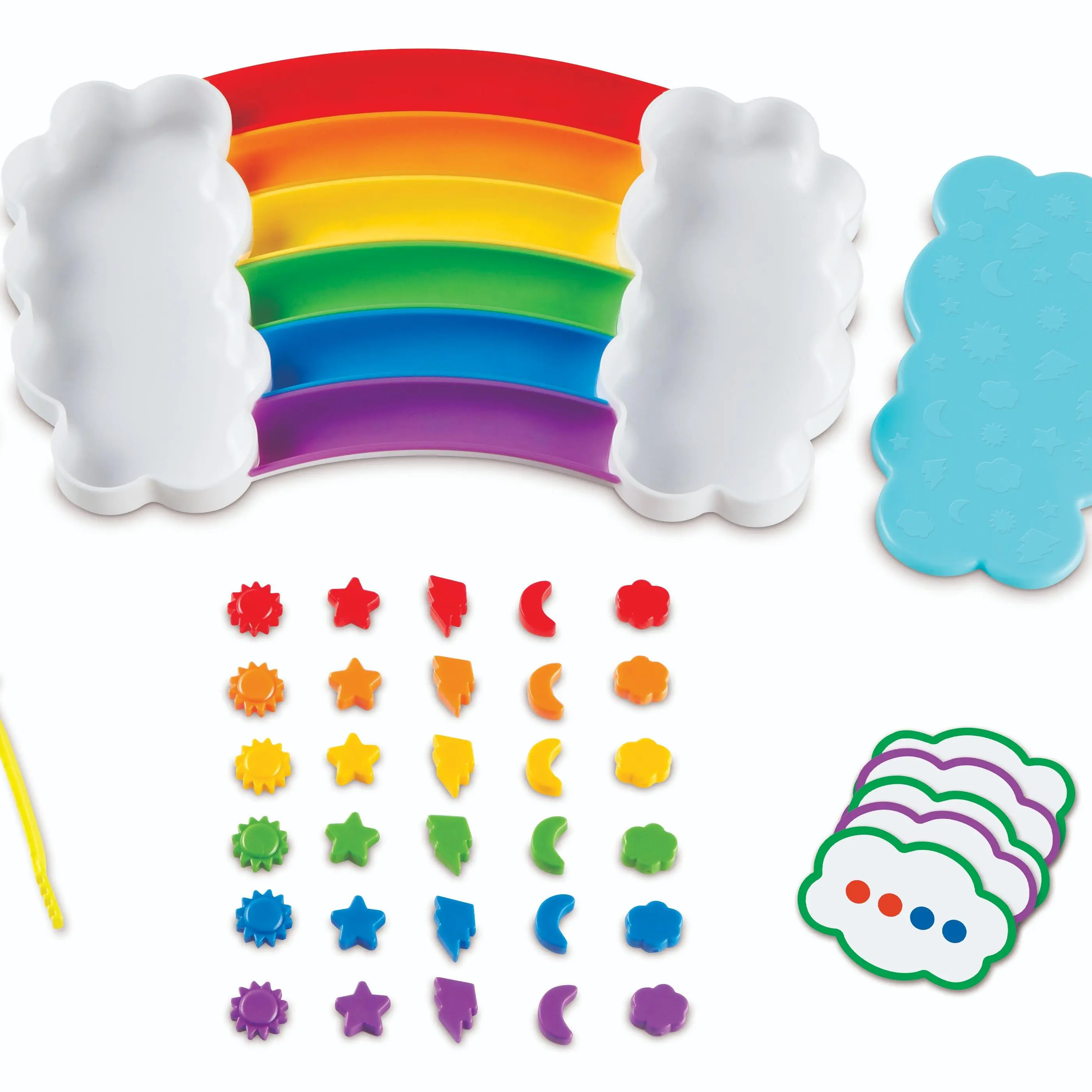 Learn a rainbow of new color and sorting skills with the help of this vibrant activity tray! Grab the specially designed fine motor tongs, then sort and match the set's 30 counters by 5 shapes (sun, star, cloud, moon, lightning bot) or 6 colors (red, orange, yellow, green, blue, purple).