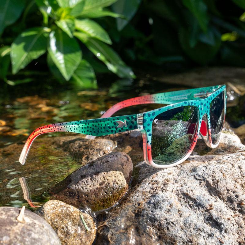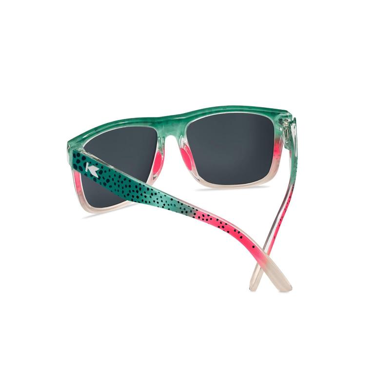 The Rainbow Trout Torrey Pines Sport sunglasses bring the vibrancy of the wild to life. Blue-green at the top of the speckled frame fades gently to crimson before ending in translucent beige along the arms. Top it off with a light blue interior for a look that comes straight from the streams of Montana. Polarized olive green lenses etched with a rainbow trout silhouette provide optimal glare reduction, making them as functional as they are eye-catching. Finished with silver K logos and pink embedded rubber nose pads, these shades combine rugged style with superior comfort. With FDA compliant, impact-resistant lenses and full UV400 protection, they’re ready for any adventure and come with a babbling river microfiber pouch for safe keeping.