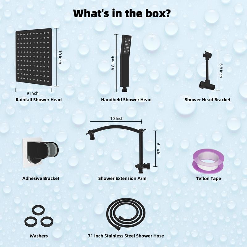 ·【Shower Head Combo】Hibbent shower combination comes with a 10-inch large square rain shower head, handheld shower head, 71-inch metal stainless steel shower hose, 16-inch shower head extension arm, adhesive shower head holder, shower head bracket, washers, Teflon tape, and installation manual. All metal stainless steel and solid brass extra long 71-inch shower hose is made of odorless EPDM material that can be used in a high-pressure and high-temperature environment.