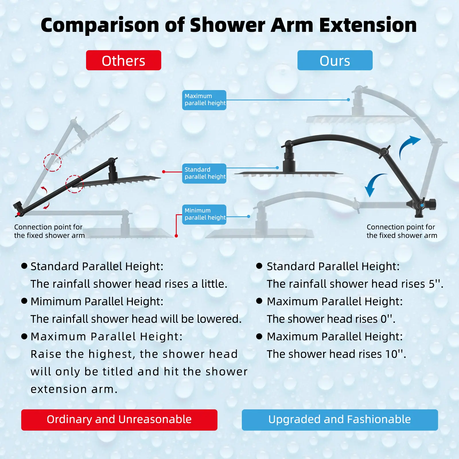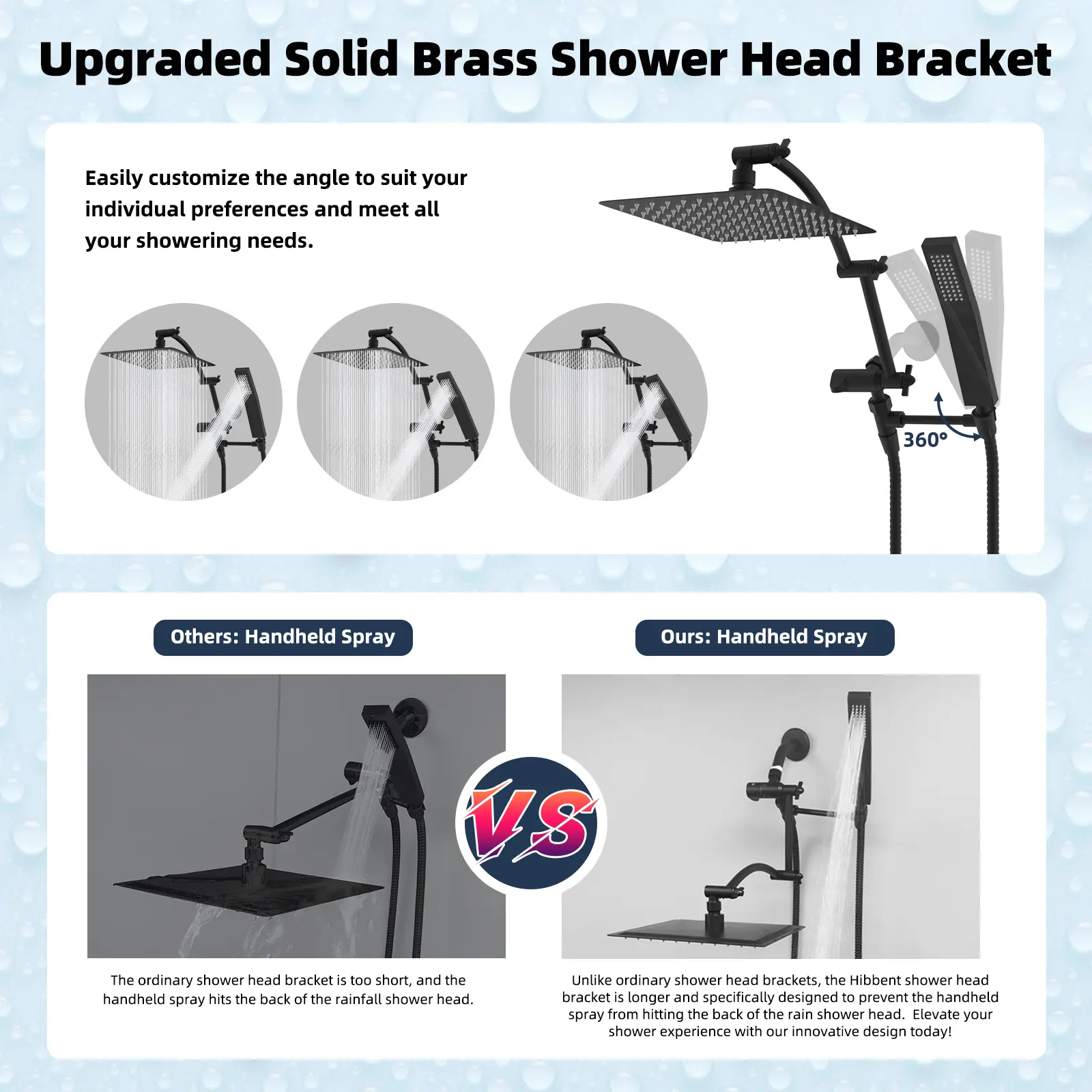 ·【16'' Upgraded Shower Extension Arm】Height & angle adjustable arc-shaped design enhances its bearing capacity, high rise your shower head to achieve vertical water. Compared with the regular shower arm extender, the Hibbent shower arm extension can raise the shower head higher or lower and keep the shower head in a horizontal position all the way. The shower head is always vertical in your large size and will not hit the shower arm, instead of sloping water like an ordinary straight shower arm.