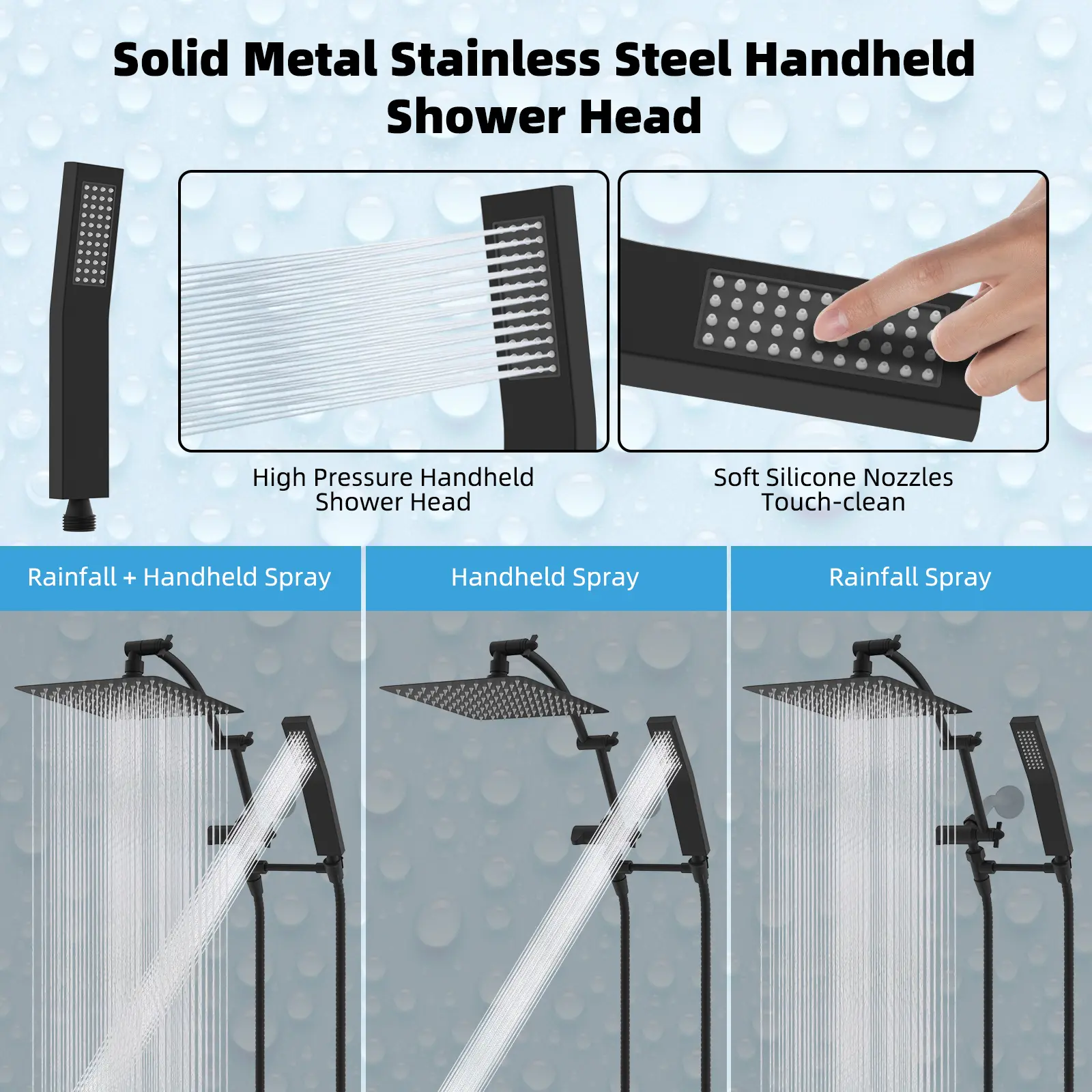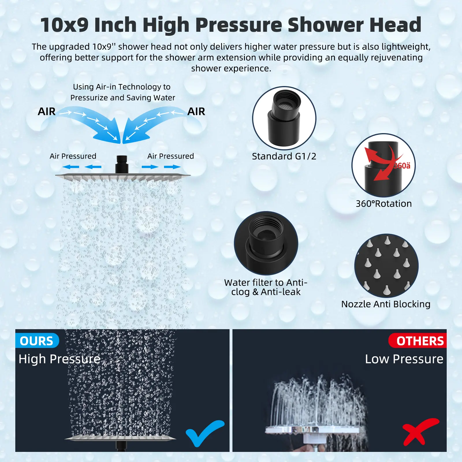 ·【10'' Metal Rainfall Shower Head】The large rainfall all-metal square shower head body is made of SUS 304 stainless steel certified to ensure rust resistance, durability, and long service life. Combined with an ultra-thin design with air-in technology, the large shower head has 144 splash jets that deliver rain spray. The brass swivel ball connector adjusts the shower head to any angle you want to enjoy a relaxing hotel-style bathing experience.