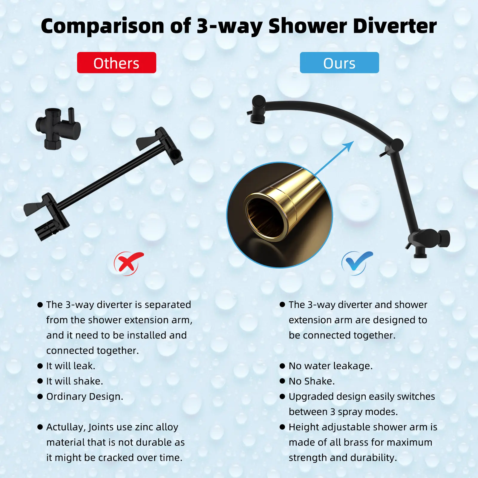 ·【Upgraded 3-Way Diverter Valve & Easy Installation】This shower head combo is very easy to install without tools or plumbers. The 3-way diverter can be used with a shower head/rainfall shower head alone, or with two showers at the same time. Our 3-way diverter and shower extension arm are designed to be connected without leaking and shaking, while an ordinary 3-way diverter is separated from the extension arm, and it needs to be installed and connected, which will lead to a leak and shake.
