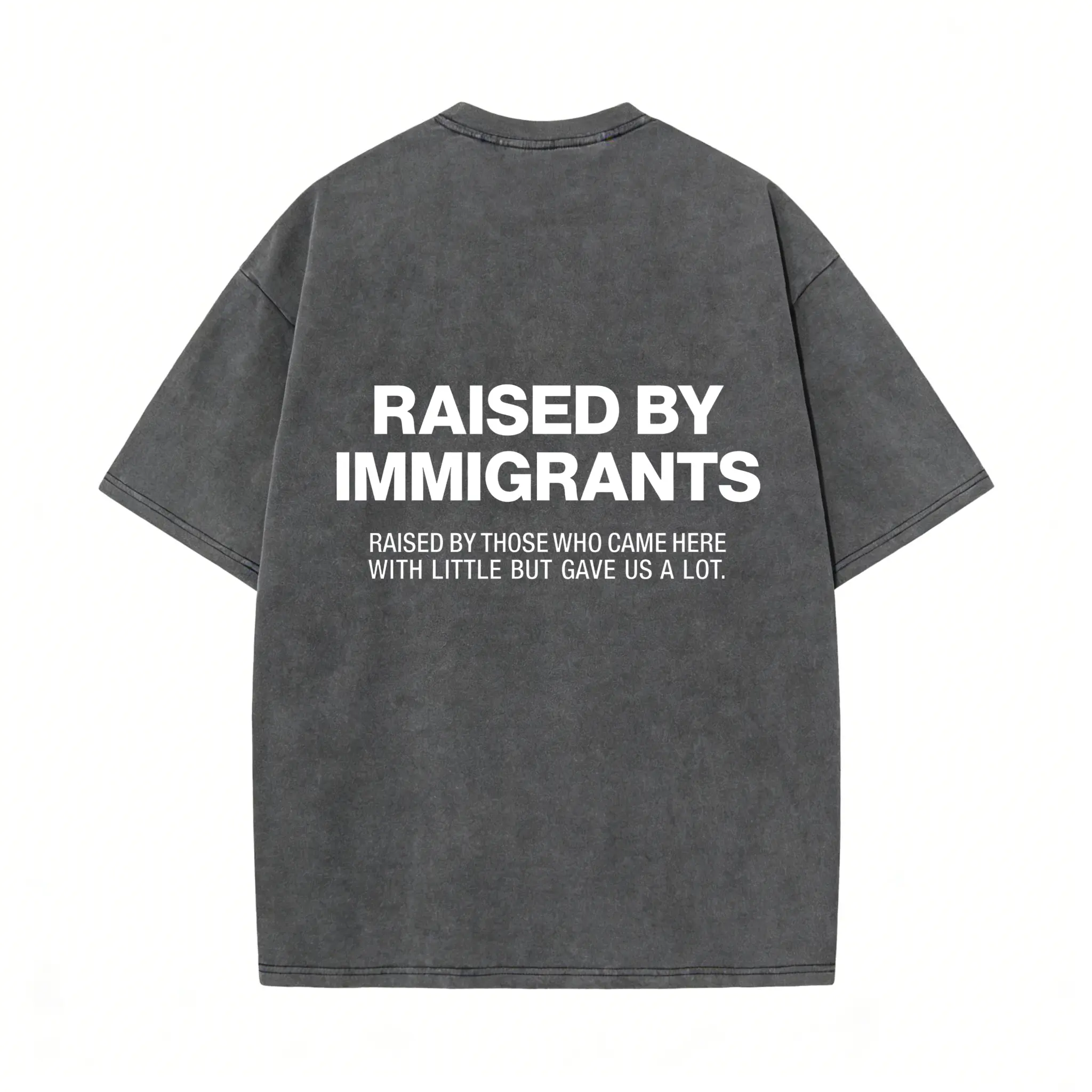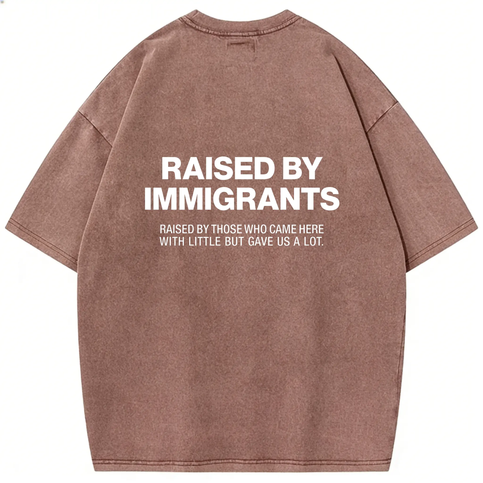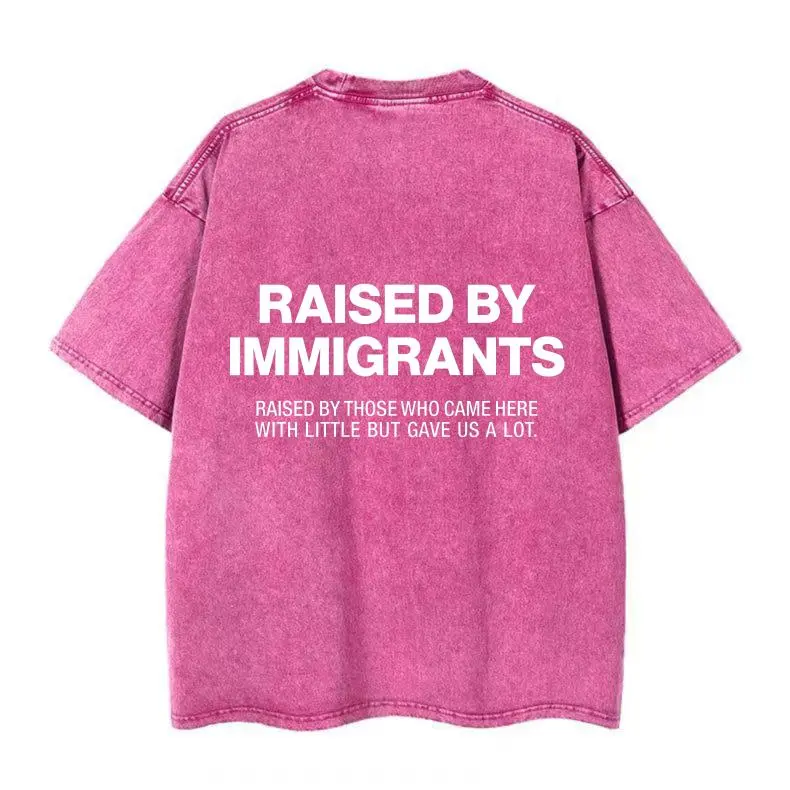 Elevate your casual wardrobe with our "Raised By Immigrants" oversized tee. Crafted from soft, heavyweight cotton in a vintage acid-washed pink, this statement piece celebrates the strength and sacrifice of those who paved the way. The bold back graphic reads "RAISED BY IMMIGRANTS" with the heartfelt subtitle "RAISED BY THOSE WHO CAME HERE WITH LITTLE BUT GAVE US A LOT." Perfect for pairing with jeans, shorts, or leggings for a trendy, TikTok-worthy look.
