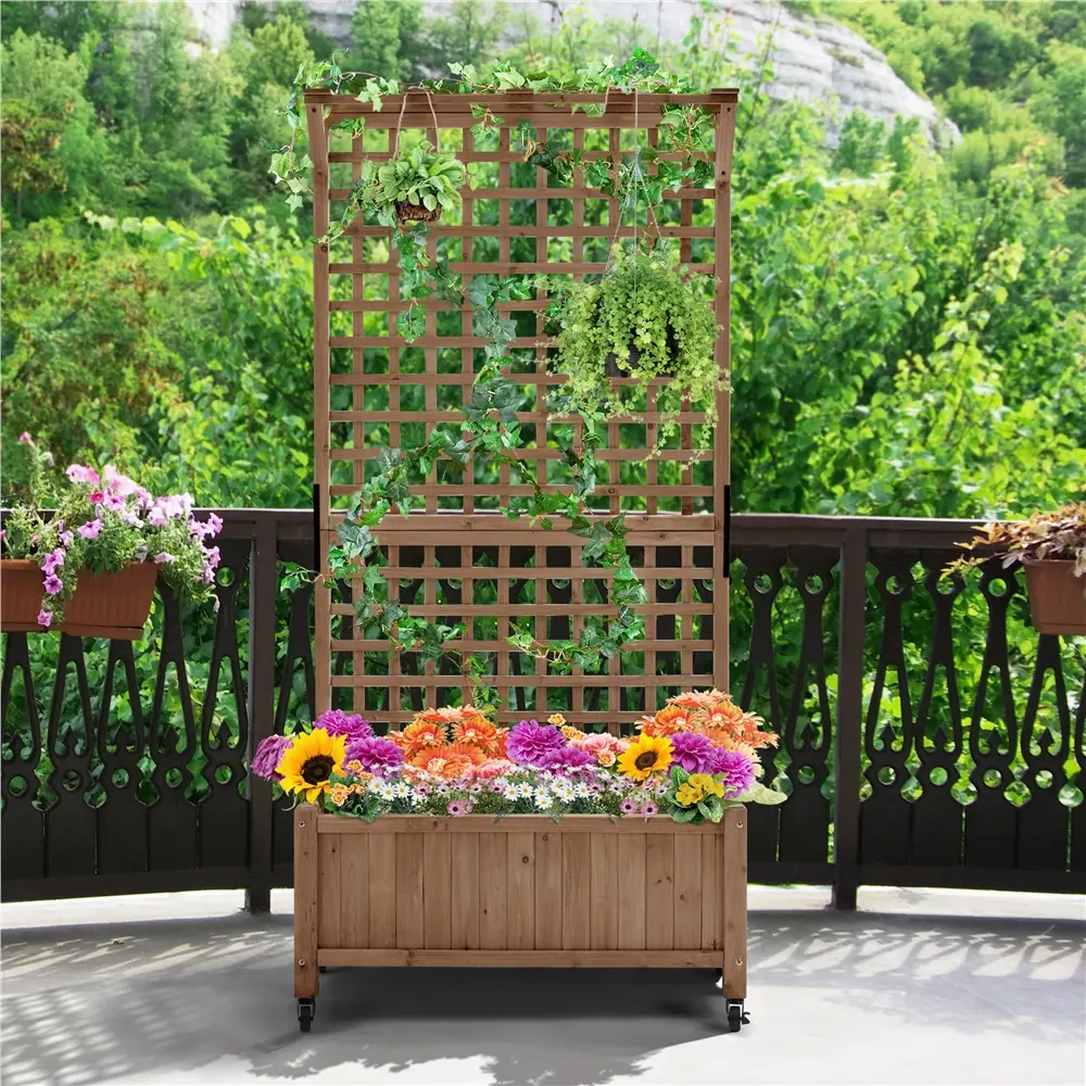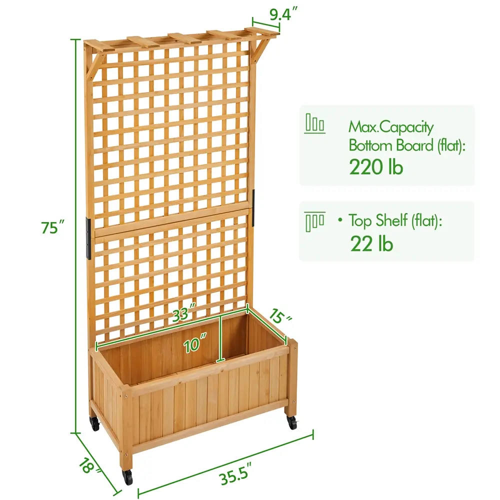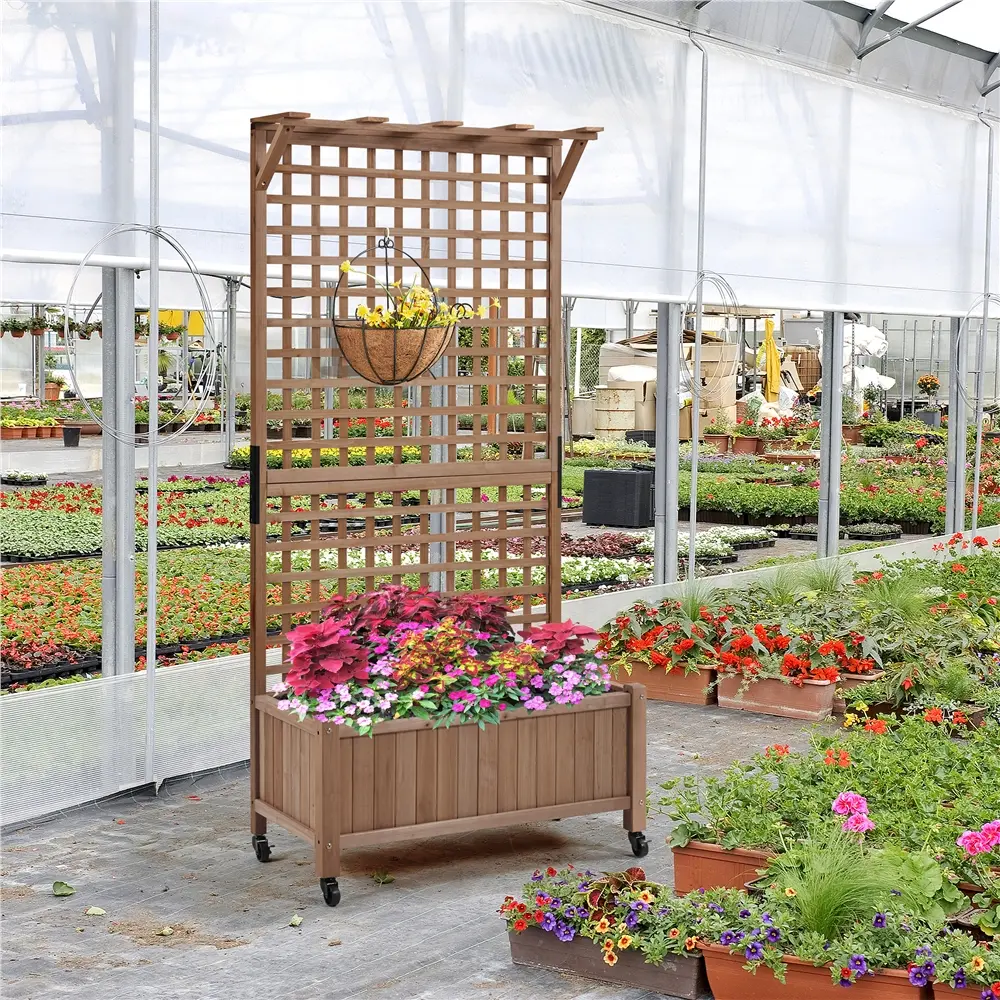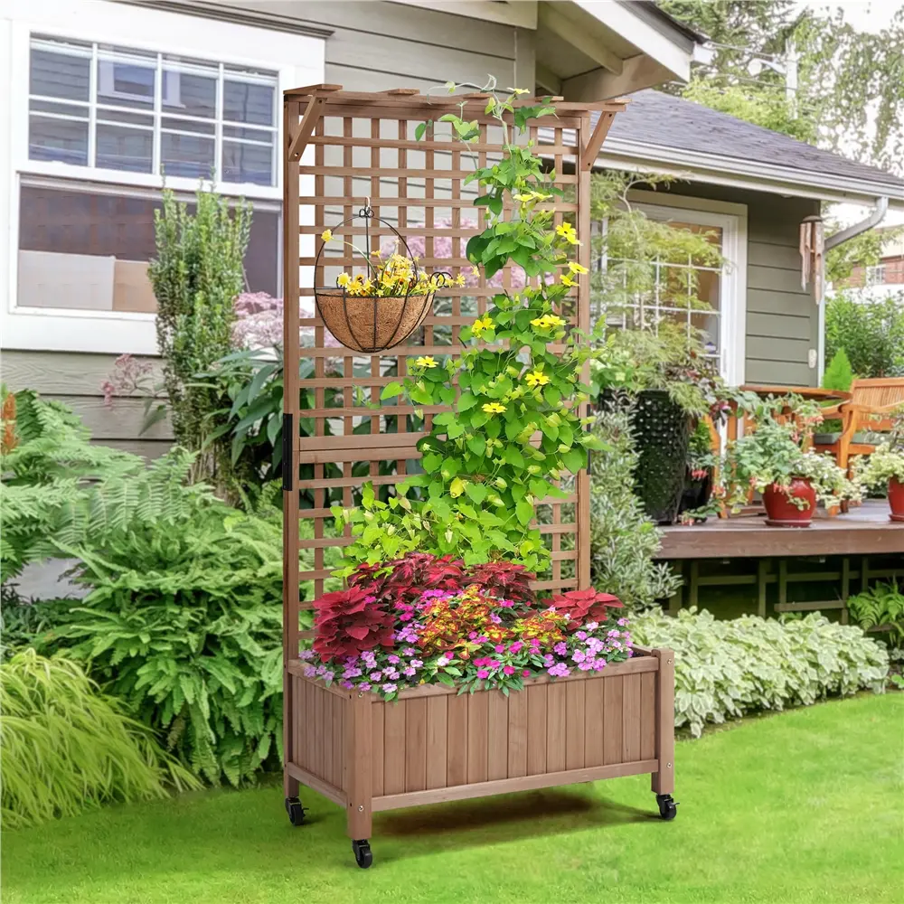 This raised garden bed with lockable wheels is perfect for climbing plants and adds charm to any space. Made from 100% fir wood, it has a smooth finish that looks great in your home. It's versatile for use in gardens, greenhouses, or yards, helping you grow plants anywhere. The built-in drainage system ensures proper watering. The trellis can also hold small items like keychains and photos, while supporting vertical plants and adding style to your décor.