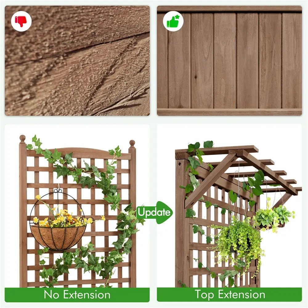 8. Extended Trellis Roof: The trellis features a unique roof design, perfect for supporting vine plants and hanging baskets.