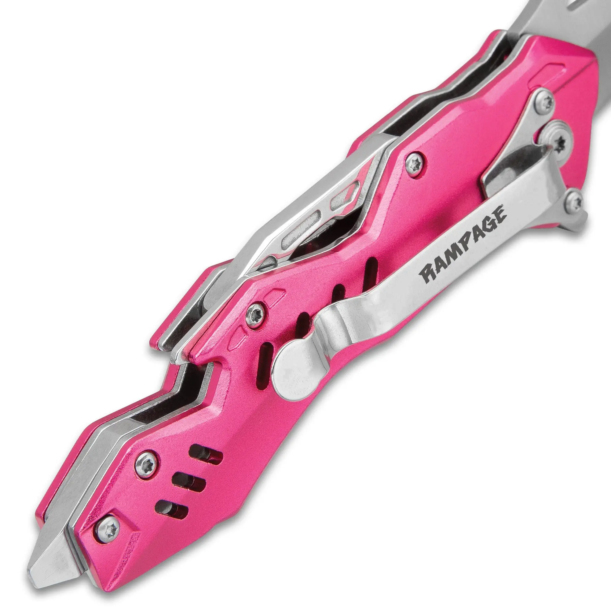 This handsome assisted opening pocket knife takes everyday carry to a new level with its sleek design and extra featuresIt has a keenly sharp, 3 1/2” stainless steel blade that can be quickly deployed using the flipper to access assisted openingThe aluminum handle is metallic pink and silver and is loaded with features with a bottle opener and a hefty glass breakerThe pocket knife is 4 3/4” when closed and also features a tough aluminum pocket clip for ease of carry