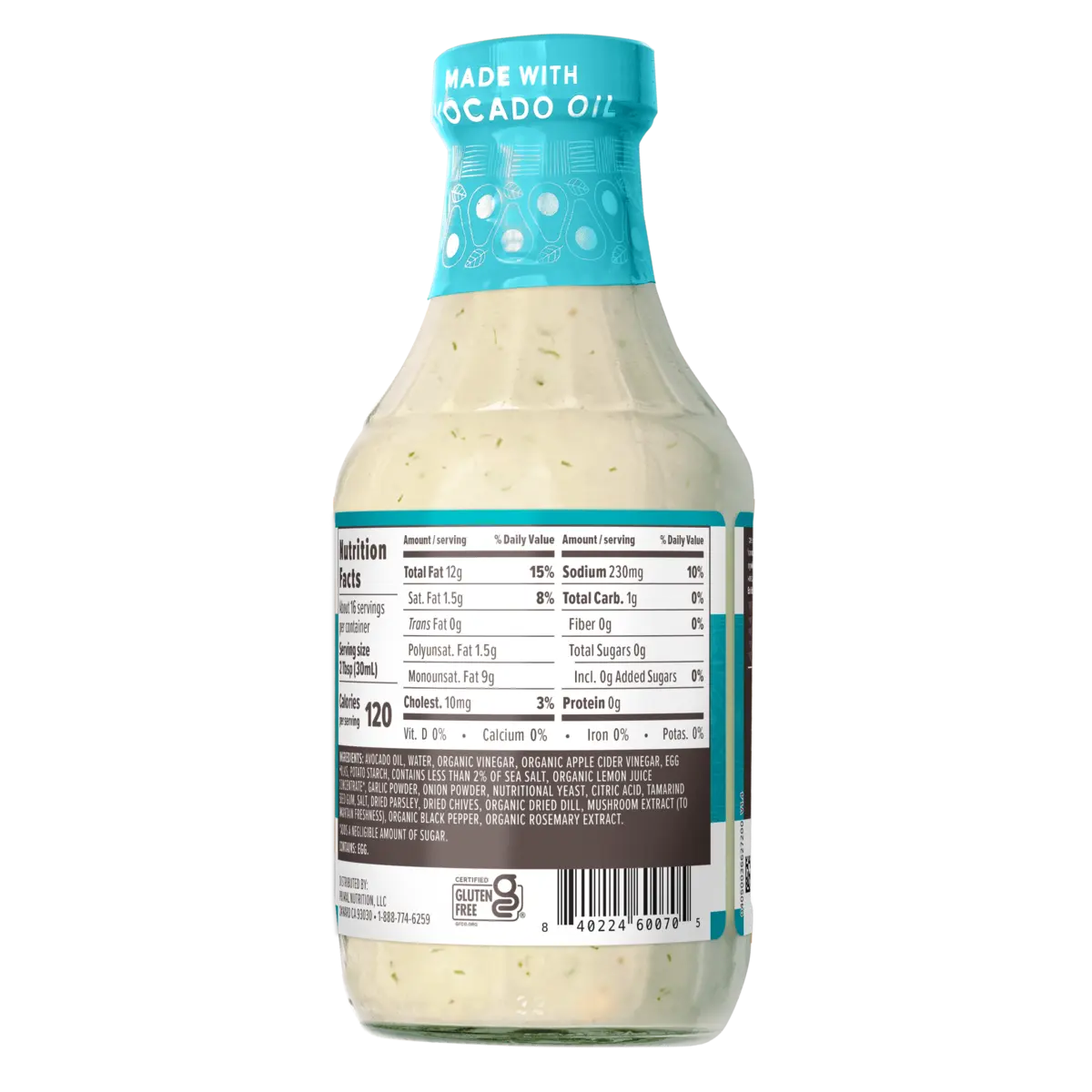 IngredientsAvocado Oil,Water,Organic Vinegar,Organic Apple Cider Vinegar,Organic Egg Yolks,Potato Starch,Sea Salt,Organic Lemon Juice Concentrate,Garlic Powder,Onion Powder,Nutritional Yeast,Citric Acid,Salt,Tamarind Seed Gum,Dried Parsley,Dried Chives,Organic Dried Dill,Mushroom Extract (To Maintain Freshness),Organic Black Pepper,Organic Rosemary Extract