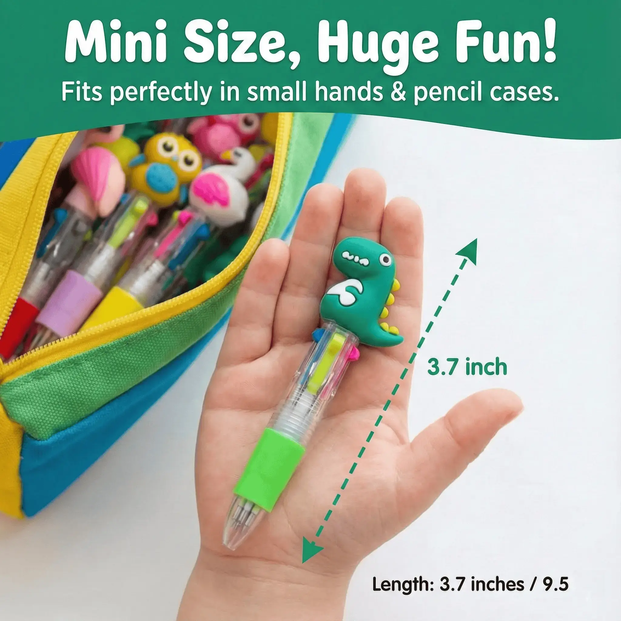 ·20Pcs Mini Multicolor Pens in one 4-in-1 set! These pens feature dinosaurs, astronauts, fruits, and animals. Perfect for kids and students, they make writing and drawing fun. Each pen includes 4 ink colors: black, red, blue, and green. Switch colors effortlessly for school, drawing, or notes. Vibrant inks ensure smooth writing without smudges.