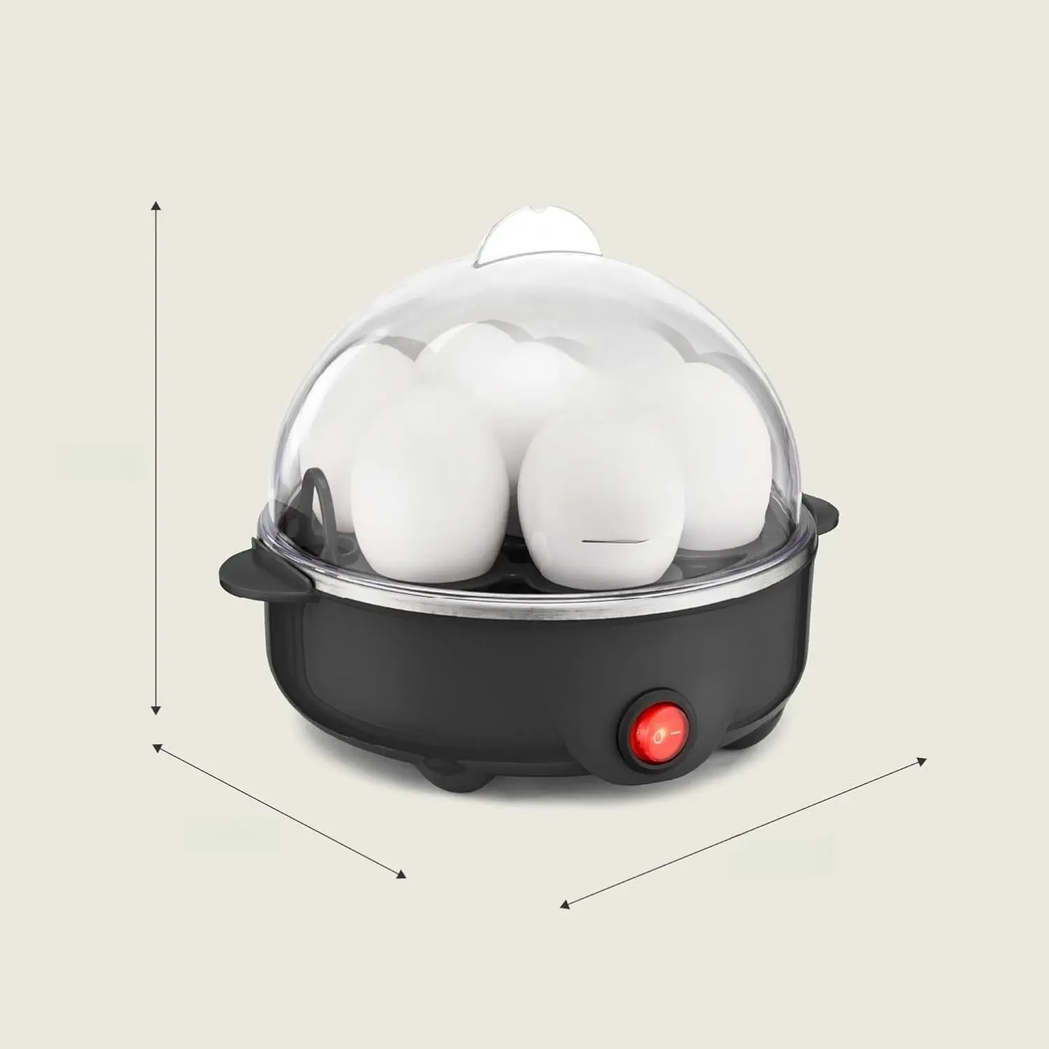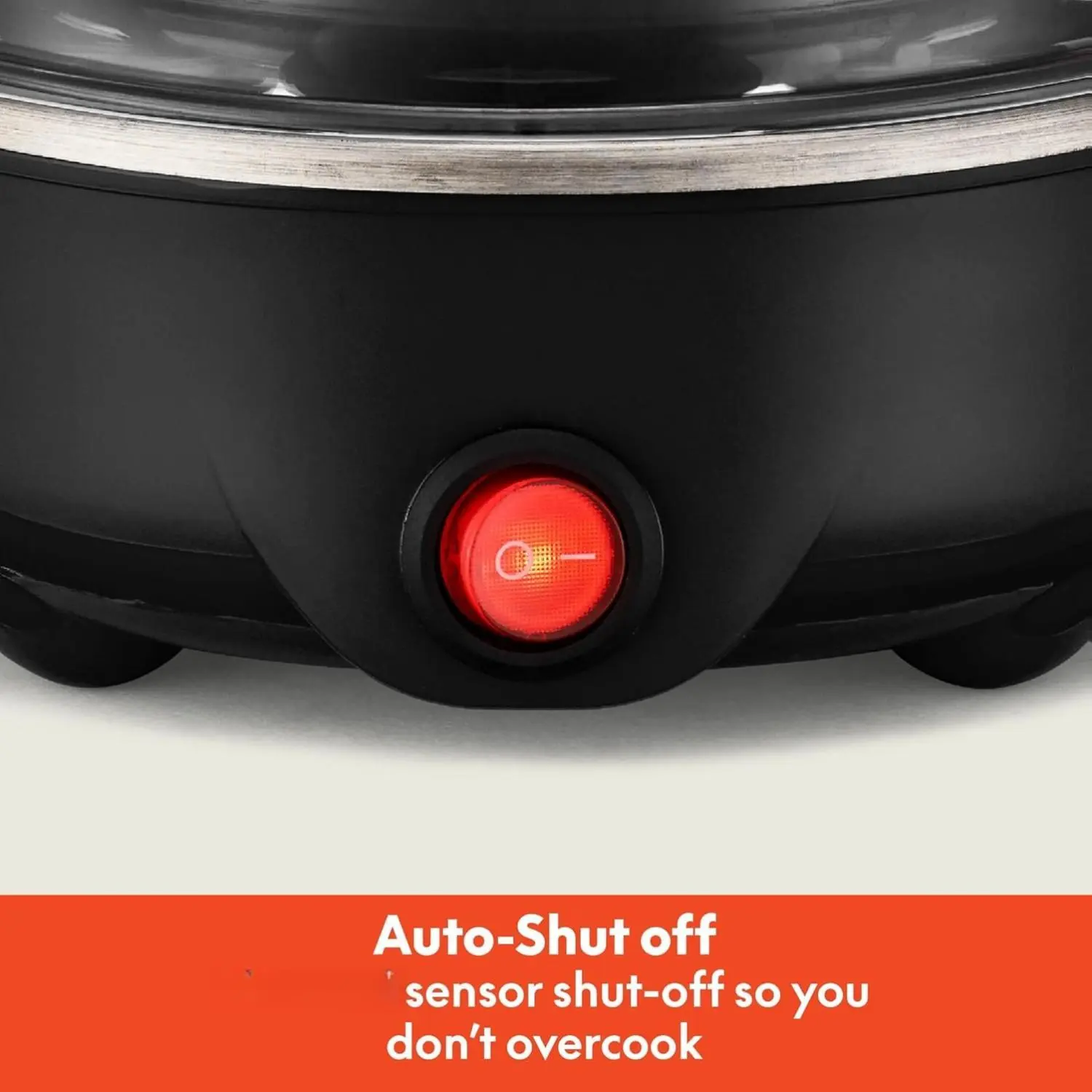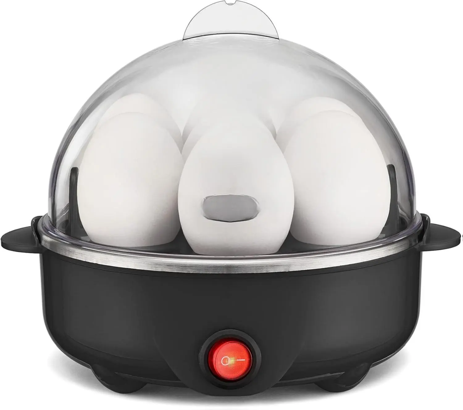 ·Eggs benedict, lunch prep, morning breakfast or afternoon snack? With the Egg Cooker, effortlessly cook all the eggs you need to feed the entire family, or meal prep for the whole week. Rapidly cook up to 7 large whole eggs, 2 perfectly poached eggs, simultaneously with the interchangeable trays. Power switch and indicator light for hassle-free automatic cooking. Cook your eggs to perfection: soft, medium, or hard boiled, using the marked measuring cup with piercing pin. This automatic egg cooker does it all: hard boiled eggs, poached eggs, steamed eggs, omelets, all with dishwasher safe, easy clean up. With the Stainless Steel heating plate and dishwasher safe clear lid, trays and measuring cup, you can enjoy a delicious family sized meals of devilled eggs, egg salad sandwiches, or morning breakfast and even meal prep for the whole week!