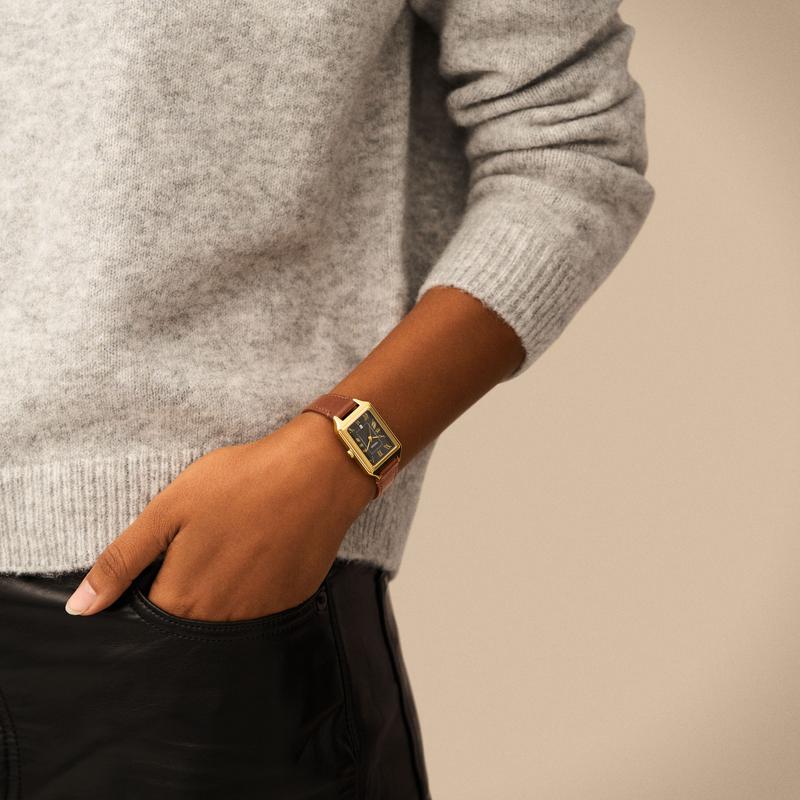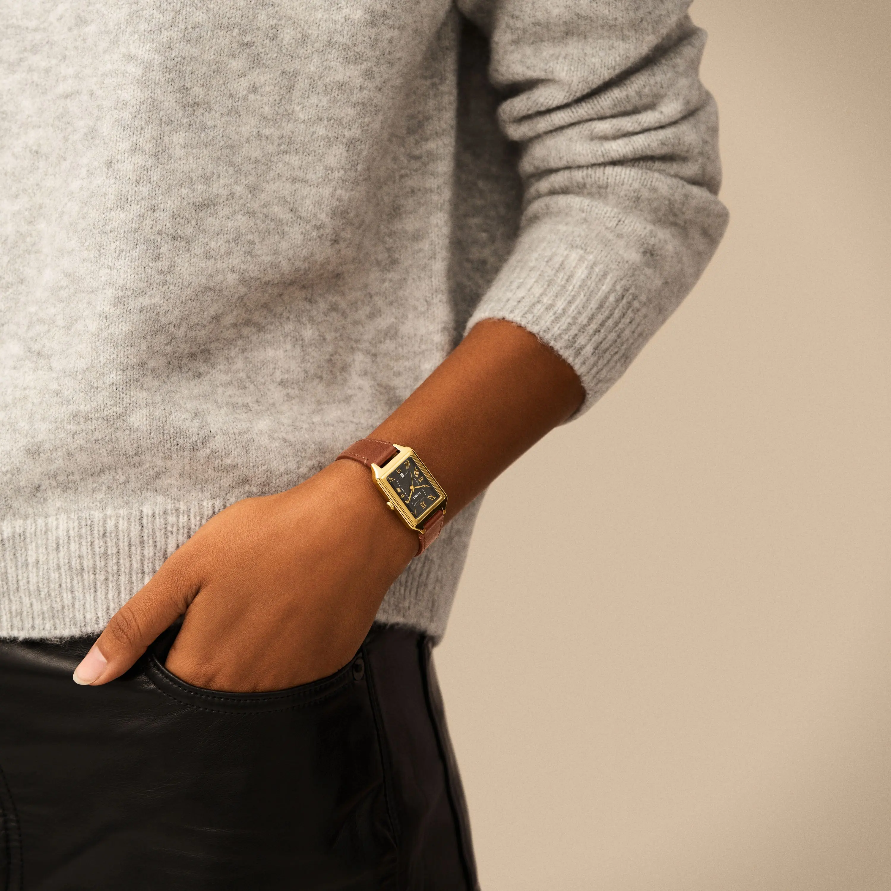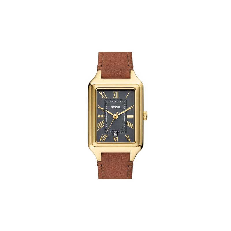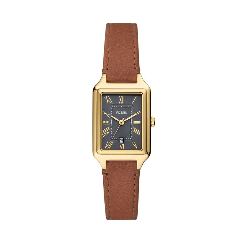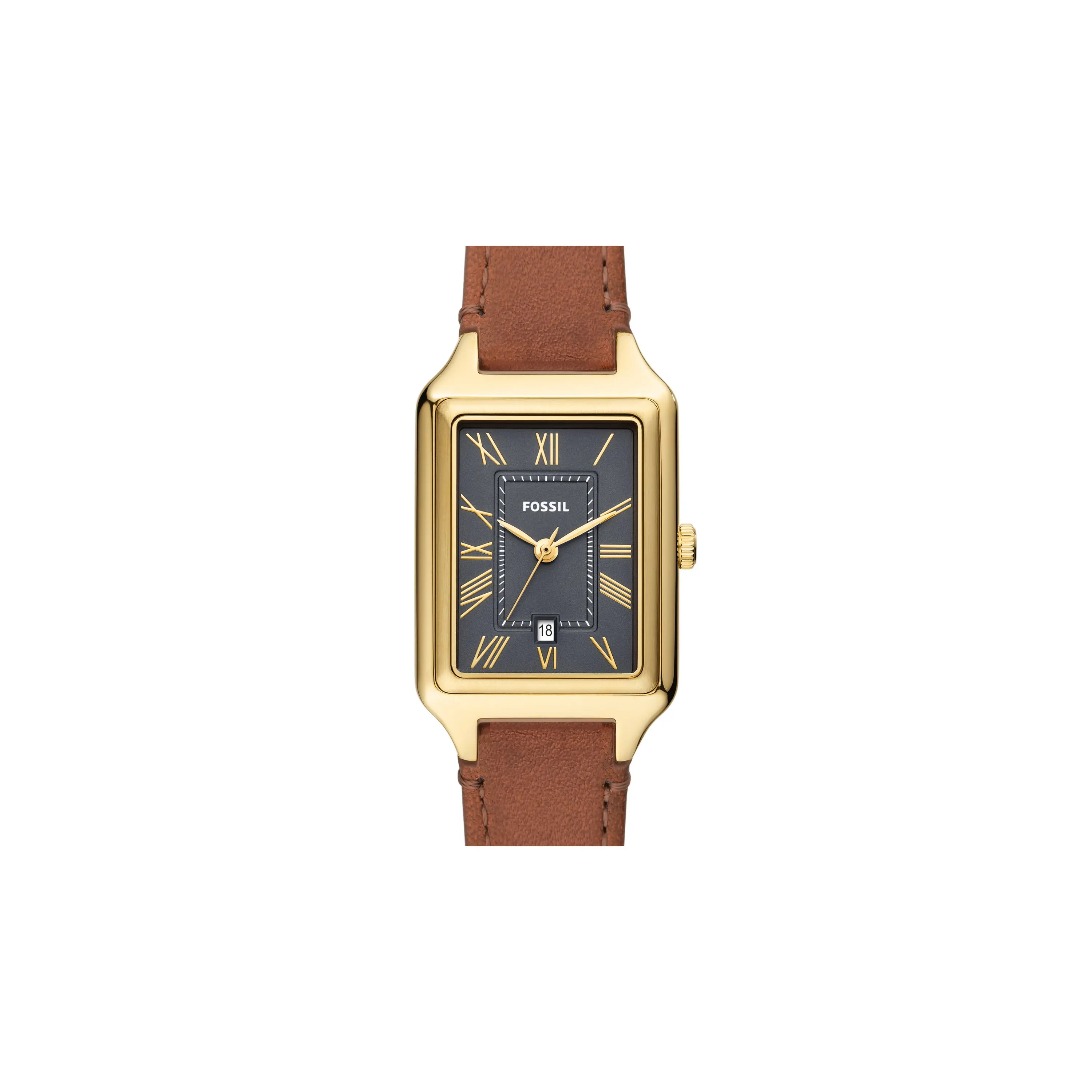 A true icon from our archives, the rectangular Raquel watch is updated for the current moment. Slim and versatile, it features a charcoal gray satin watch face, three-hand date movement and a brown leather strap. Fossil leather products support responsible manufacturing via the Leather Working Group.