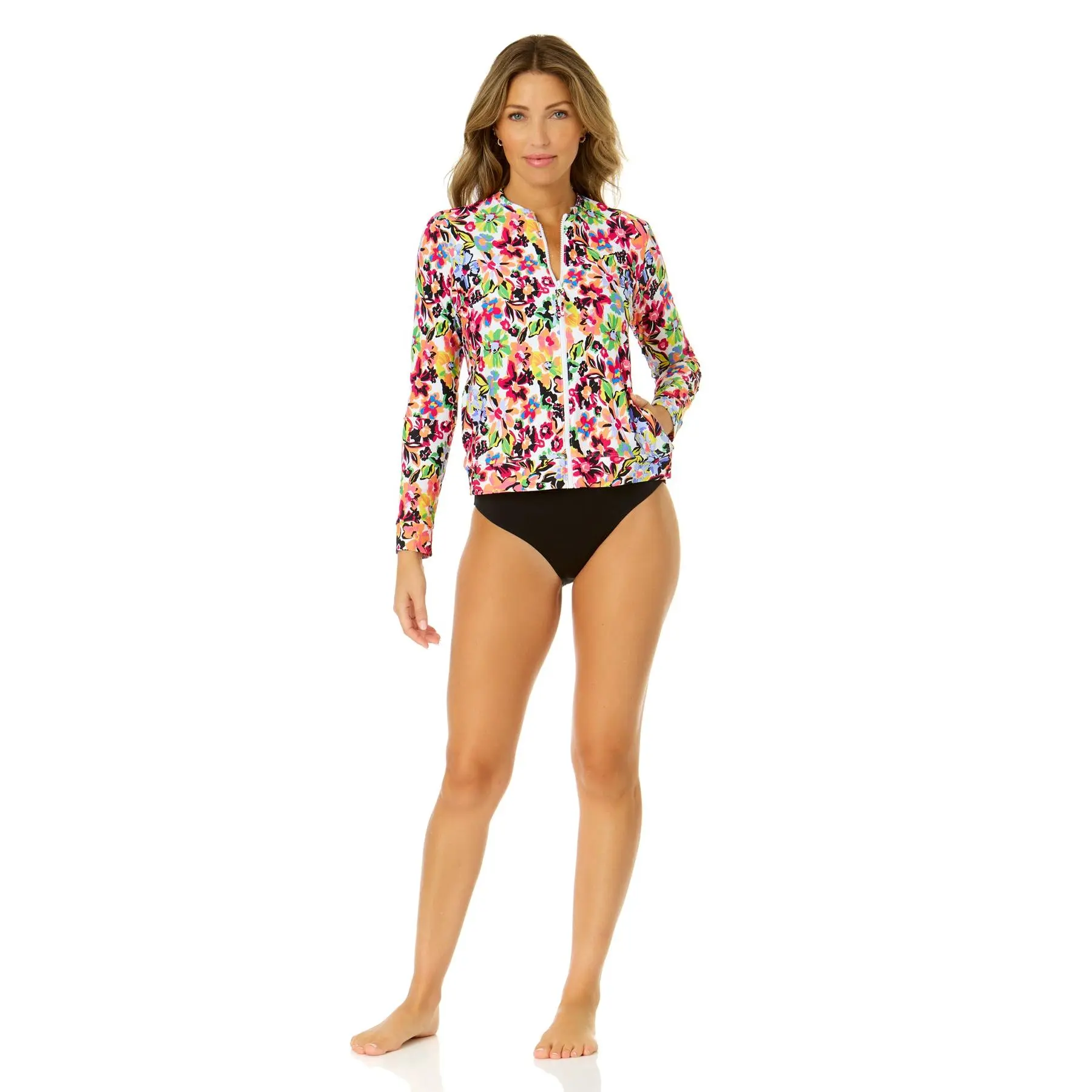 Look ready to hit the beach this summer in our Long Sleeve Zip Front Rash Guard Top. This floral rash guard top has long sleeves to provide UV protection for your skin and arms, while the front zip detail allows you to style your look over a bikini or one piece swimsuit. Whether in or out of the water, this rash guard top will ensure your skin stays protected and warm in the cold ocean water!