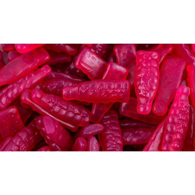 Raspberry flavored gummies shaped like soda bottles.